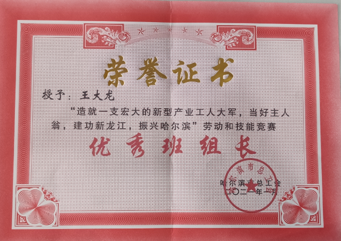 王大龙作为焊接班组长,他立足岗位,心系公司发展,践行使命担当,当遇到产品焊接难度大、生产任务工期短、质量要求高等困难时,他总是充分发挥党员的先锋模范作用,冲锋在前,钻研突破技术难题,身先士卒奋战一线,带领铆焊一组出色的完成公司交予的各项生产任务,班组多次被公司评为先进班组、工人先锋号,其个人被公司评为“合理化建议之星”、“爱岗敬业标兵”,2021年1月被哈尔滨市总工会评为“优秀班组长”。从步入职场到如今,王大龙从事焊接工作已十余载,但他在工作中从未有丝毫懈怠,凭着一腔热爱、一份责任,他不畏高温、不惧困难,始终执起手中的焊枪,完成一道道高质量的焊缝,虽然偶尔身有烫伤,但心有热爱,肩负使命,他从不叫苦叫累,他以过硬的技术和出色的成绩,在平凡的岗位上“焊”卫匠心、诠释工匠精神。