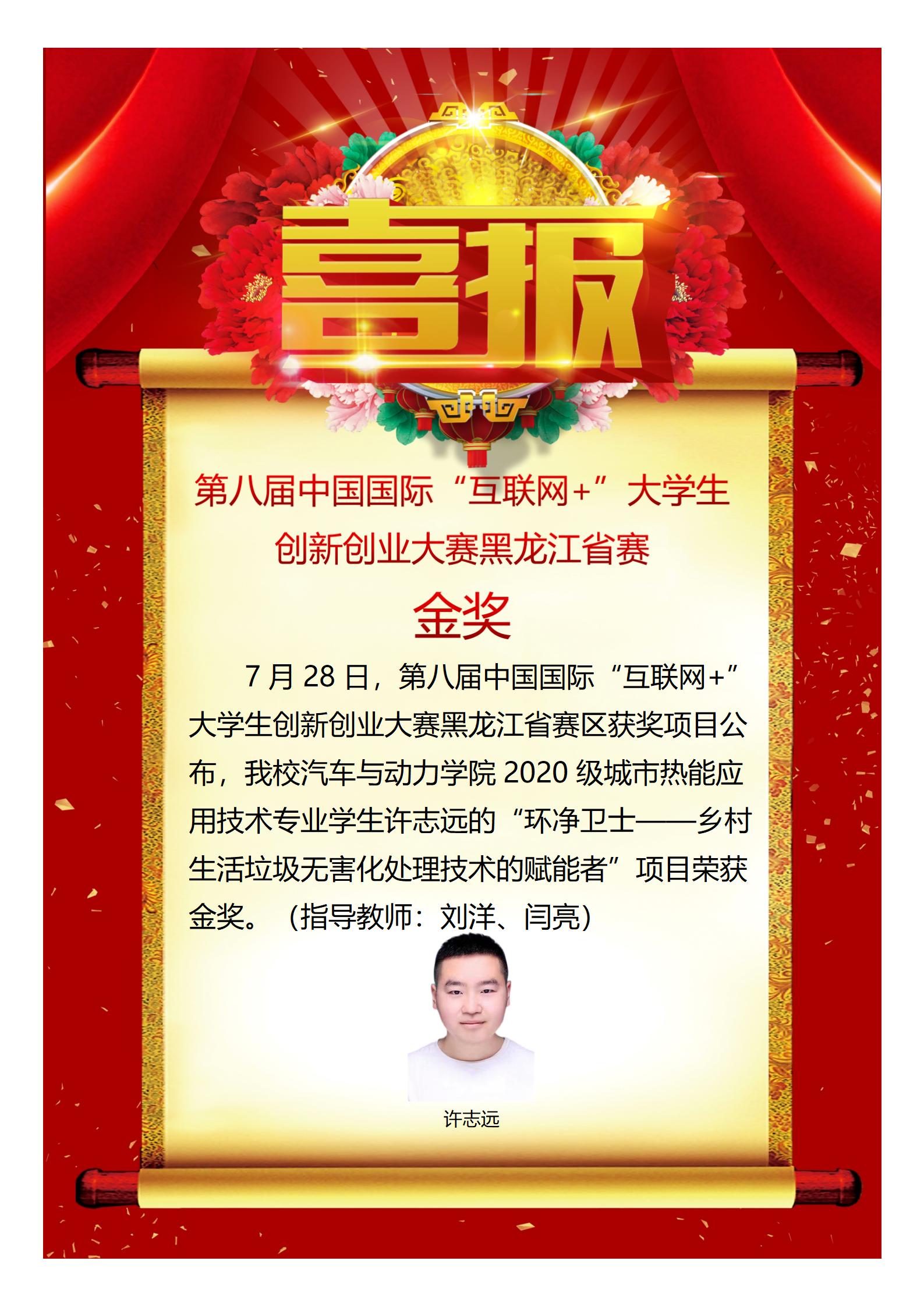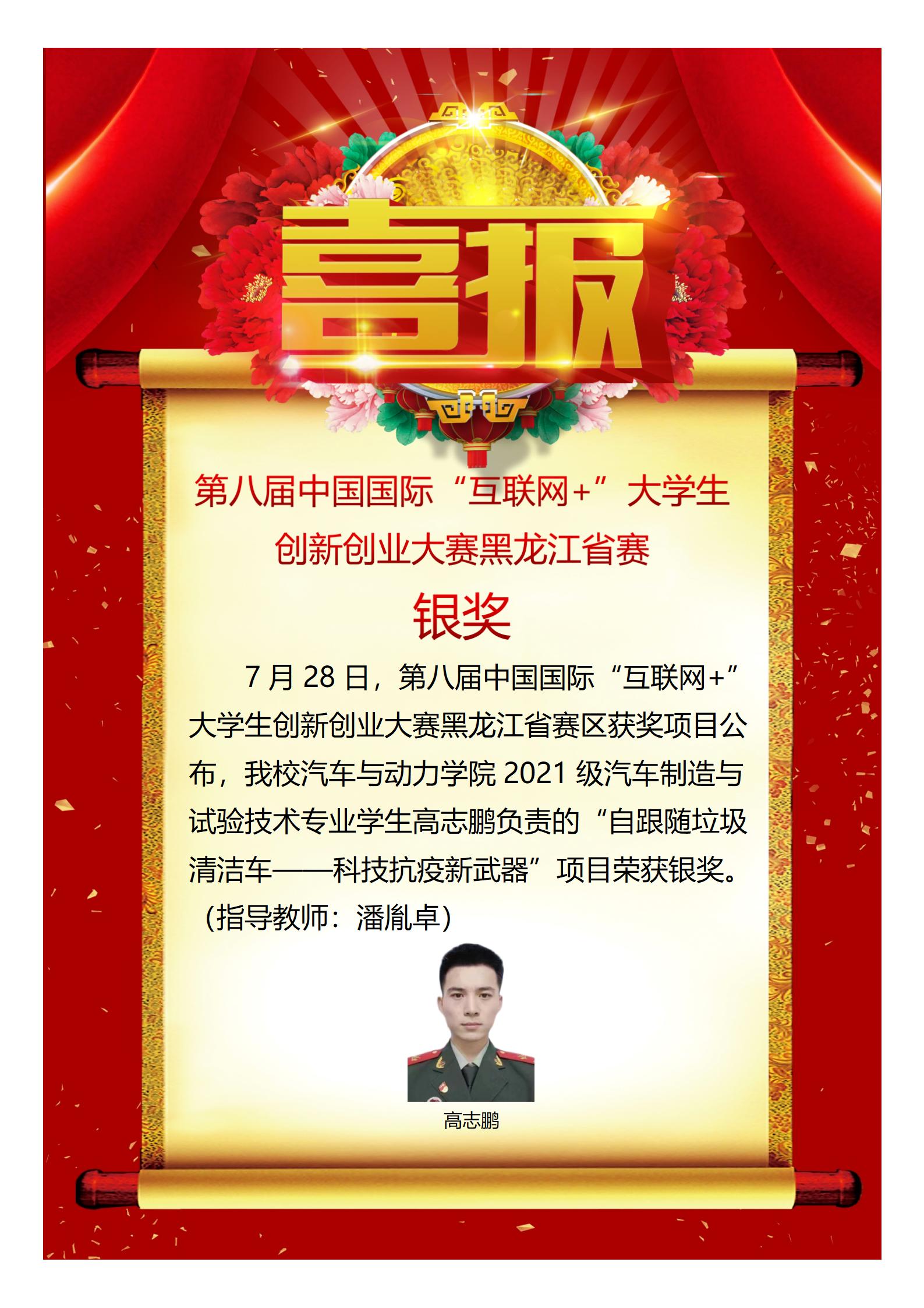 7月28日,第八届中国国际“互联网+”大学生创新创业大赛黑龙江省赛区获奖项目公布,我院2020级城市热能应用技术专业学生许志远的“环净卫士——乡村生活垃圾无害化处理技术的赋能者”项目荣获金奖,2021级汽车制造与试验技术专业学生高志鹏负责的“自跟随垃圾清洁车——科技抗疫新武器”项目荣获银奖。