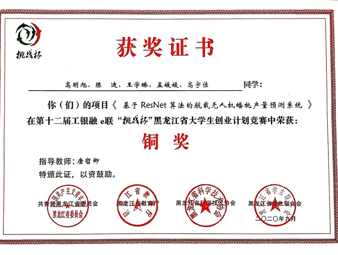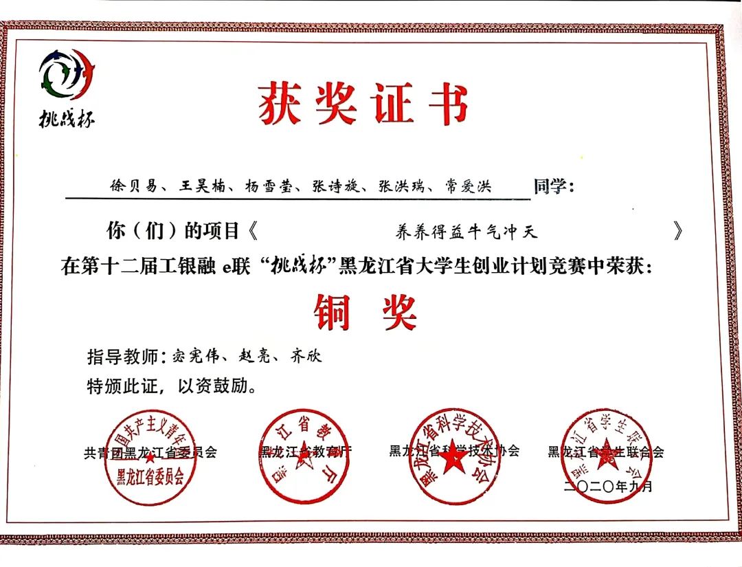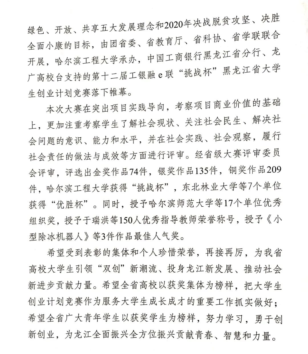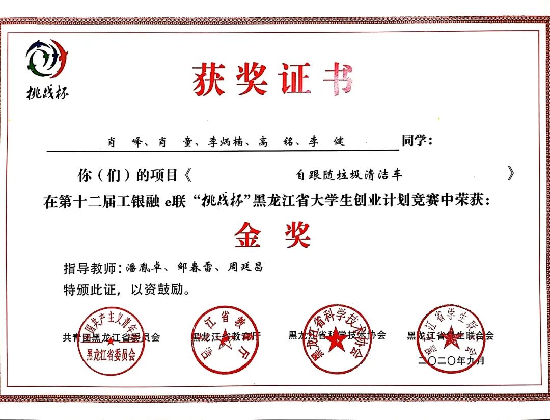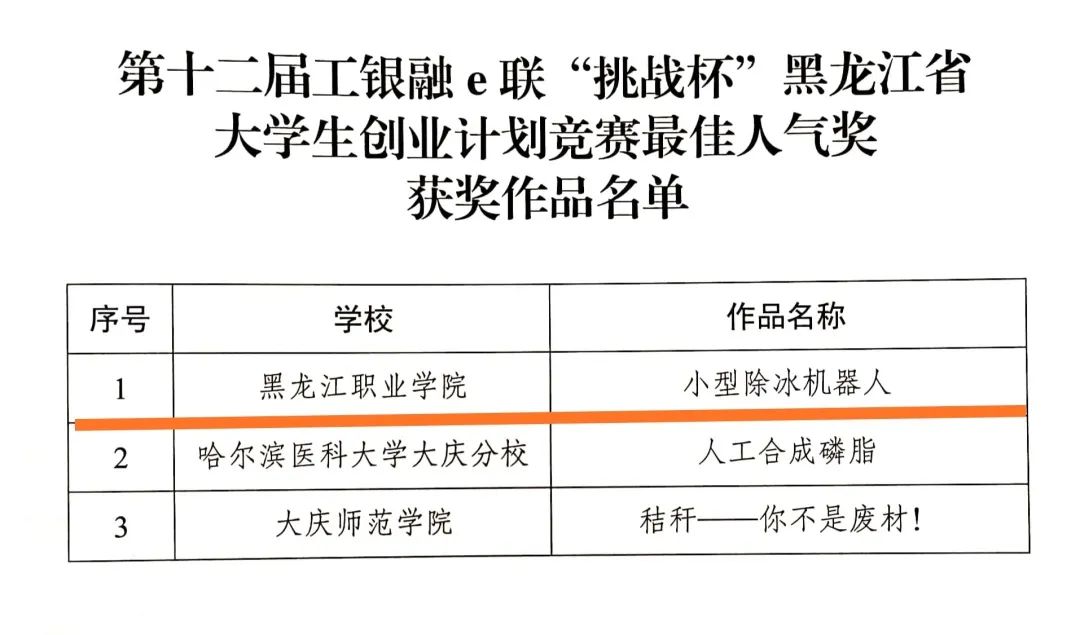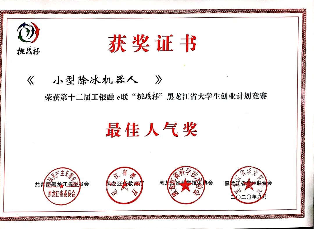 9月8日,团省委、省教育厅、省科学技术协会、省学生联合会联合印发了《关于表彰第十二届工银融e联“挑战杯”黑龙江省大学生创业计划竞赛获奖集体和个人的决定》(黑青联字[2020]13号)文件,在全省各高校209件作品入围决赛的作品中,伟德官网参赛项目荣获大赛金奖4项、银奖2项、铜奖3项,有3项作品被推荐至国赛,由机械工程学院潘胤卓老师指导、肖童同学负责的《小型除冰机器人》项目以总票数排名第一的成绩荣获“最佳人气奖”,伟德官网荣膺大赛“优胜杯”,创造了伟德官网“挑战杯”参赛史最佳成绩。