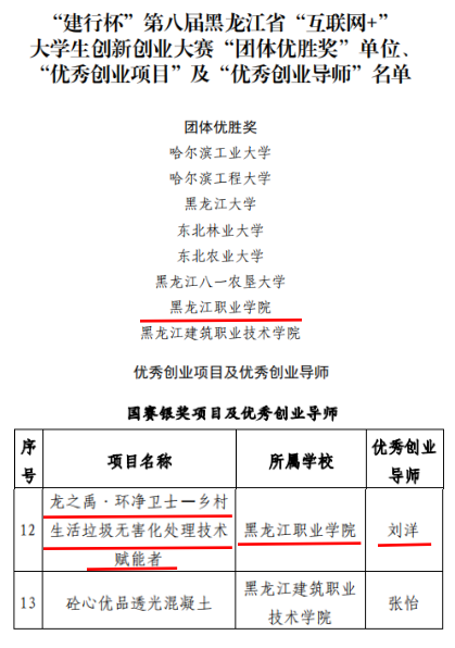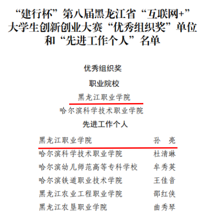 “建行杯”第八届黑龙江省“互联网+”大学生创新创业大赛“团体优胜奖”单位、“优秀创业项目”及“优秀创业导师”名单