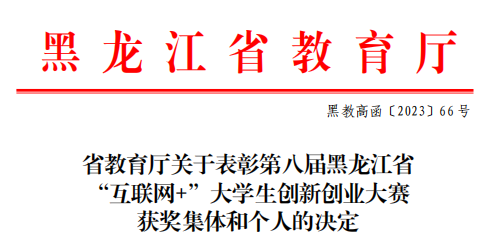 近日,伟德官网收到省教育厅印发的《关于表彰第八届黑龙江省“互联网+”大学生创新创业大赛获奖集体和个人的决定》(黑教高函[2023]66号)。
