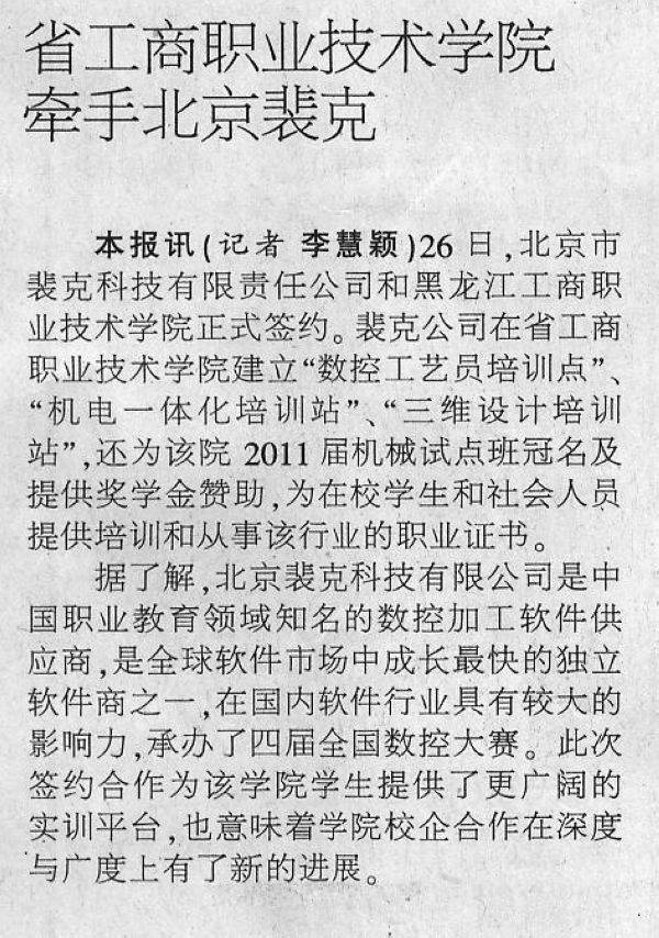 本报讯(记者 李慧颖)26日,北京市裴克科技有限责任公司和黑龙江工商职业技术学院正式签约。裴克公司在省工商职业技术学院建立“数控工艺员培训点”、“机电一体化培训站”、“三维设计培训站”,还为该院 2011届机械试点班冠名及提供奖学金赞助,为在校学生和社会人员提供培训和从事该行业的职业证书。