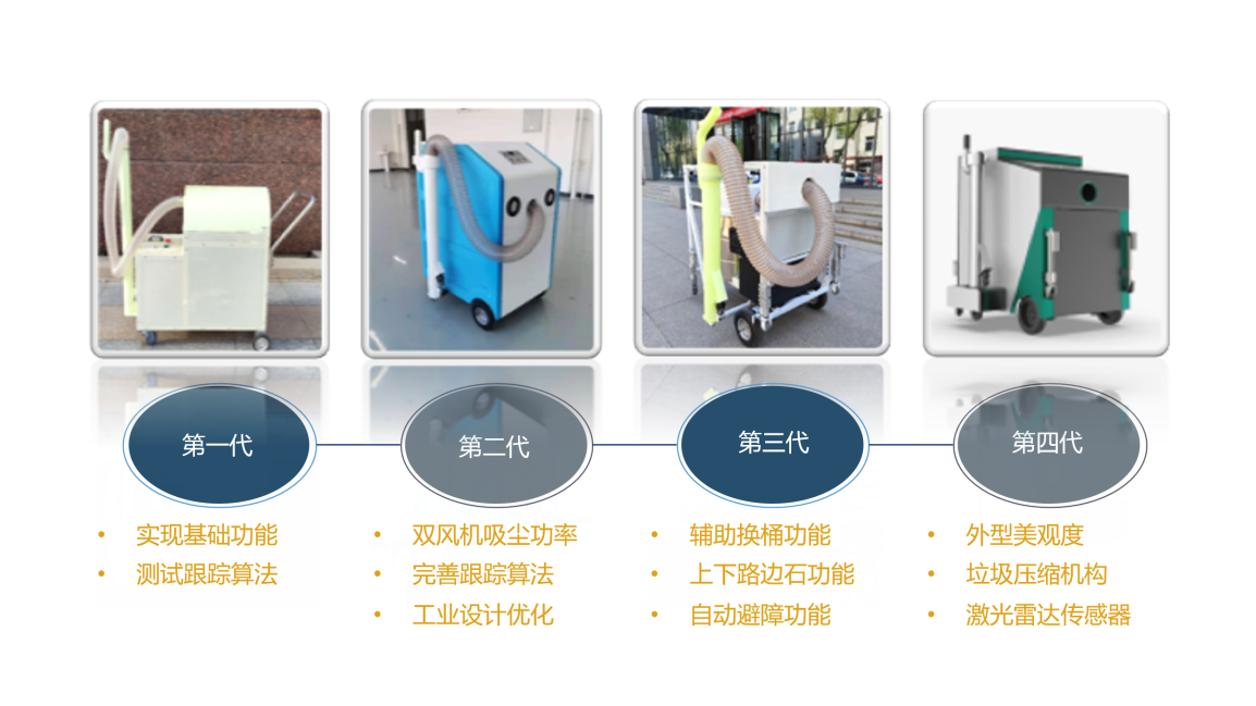 自跟随垃圾清洁车采用UWB智能定位技术,实现清洁车自动跟随工人行走,工人只需操作吸尘管作业,减小工人劳动强度,提升作业质量。作业中尘土全部吸入负压腔,避免扬尘和工人接触,减小新冠病毒的传播几率,改变了传统园区的清洁方式。可在人行道、小区、园区内部等狭小道路进行清洁作业。该设备共四次迭代升级,性能稳定完善。
