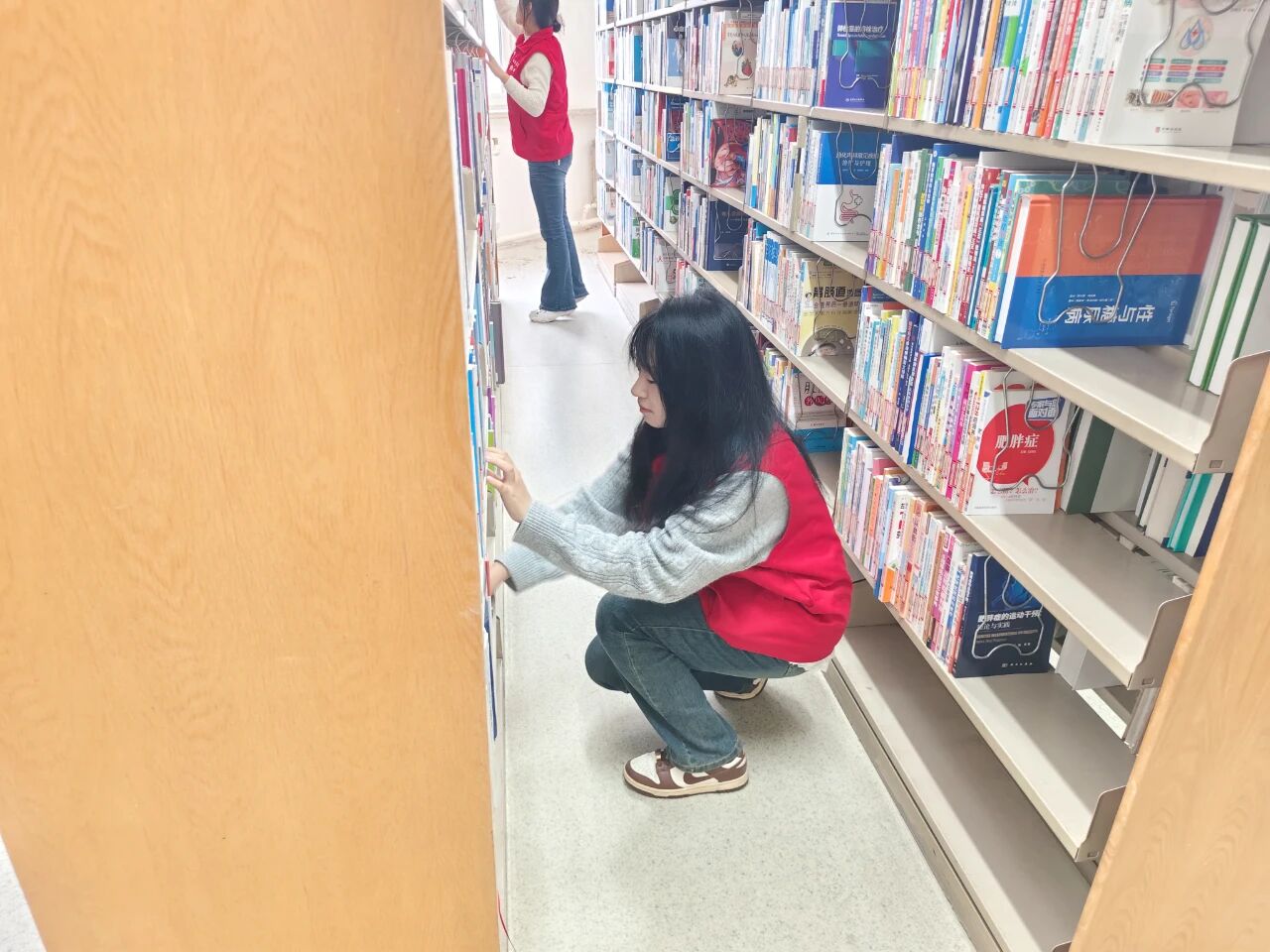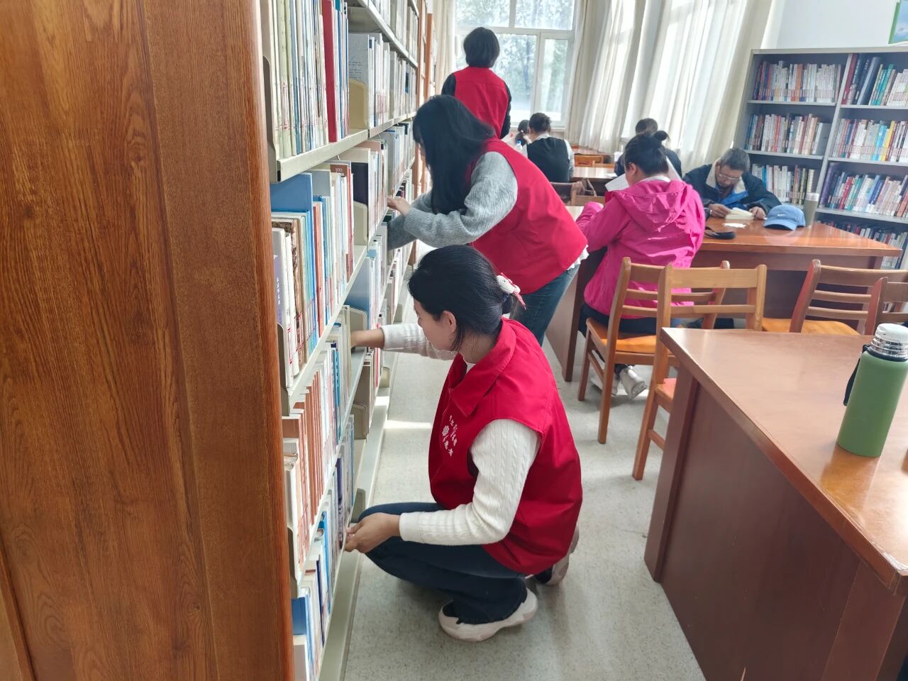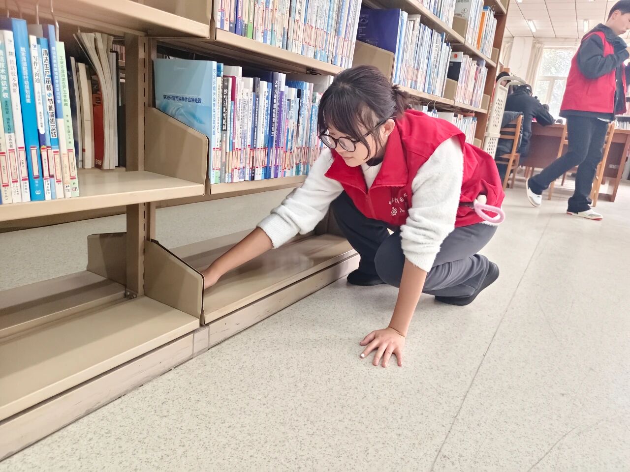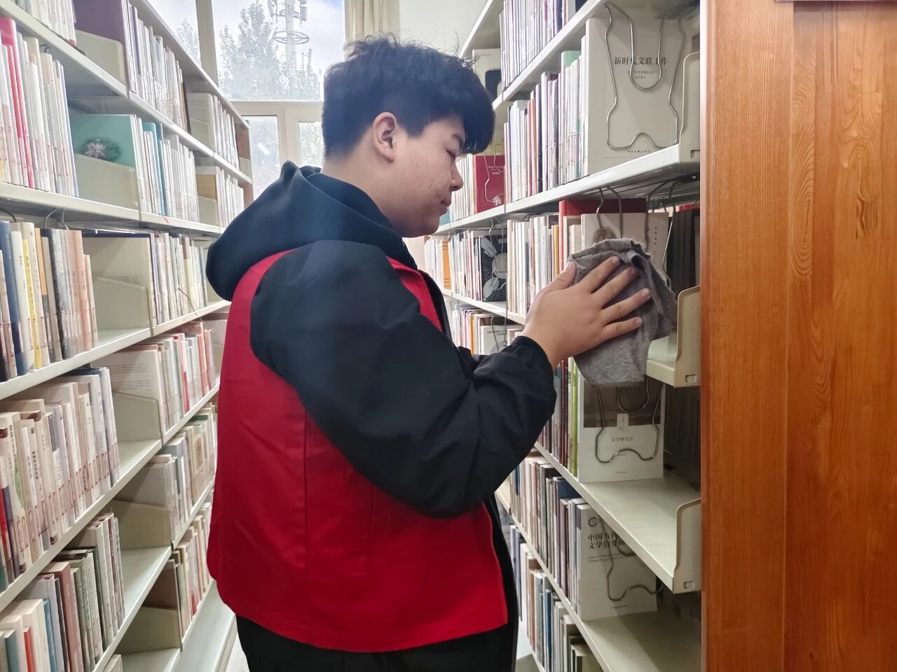 志愿者们满怀服务的激情,动作流畅而稳健。他们耐心地拂去书架每一处缝隙的积尘,将陈列的书籍按门类仔细归整、有序排布。凭借着全神贯注的投入和默契无间的协作,各项整理工作得以快速推进。每一册书卷都经过他们轻柔的擦拭,最终被准确无误地送回原处。