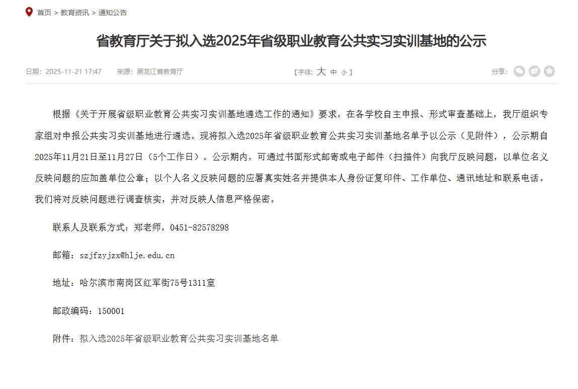 近日,黑龙江省教育厅发布《关于拟入选2025年省级职业教育公共实习实训基地的公示》,分院申报的“智能制造技术公共实习实训基地” 成功入选,标志着在职业教育实践教学基地建设领域再获省级权威认可。
