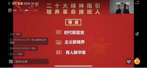 12月2日下午,按照学校通知要求,马克思主义学院党总支书记程刚紧扣“砥砺奋进新征程、学习贯彻党的二十大”这一主题,为智能制造技术学院全体教职工带来了一场题目为《学习党的二十大振兴我中华——党的二十大精神指引 培养革命接班人》的理论宣讲盛宴。从导言、时代新宣言、主义新境界、育人新华章四个方面,通过融入《论语》、《易经》、《孟子》、《道德经》等国学元素,通俗易懂、活泼有趣的形式,用听得懂、接地气的语言,打通宣讲“最后一公里”。系统阐述建党以来特别是中国改革开放以来取得的伟大成就,党的二十大报告更像是一本百科全书,歌颂了中国共产党取得的丰功伟绩和为世界所做的巨大贡献。