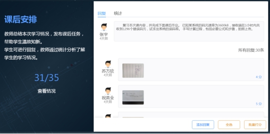 在今日课堂的课后环节,有“课后安排”的环节,学生既可以输入文字,来回复问题,也可以上传图片。这样就教师可以利用它,布置如:绘图、计算等手写的课后作业,学生完成后可以拍照上传,教师在平台上就可以收作业,批改作业了。