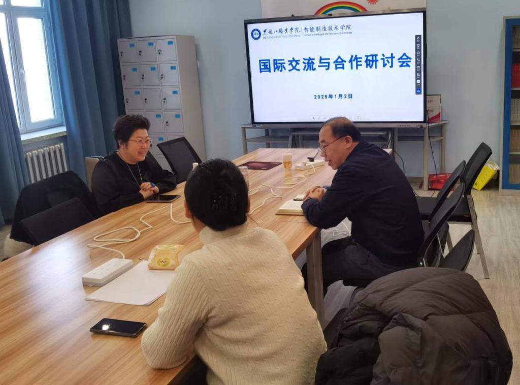 2025年1月2日,智能制造技术学院召开国际交流与合作研讨会,院长李子峰,副院长于雪梅,哈尔滨毅旭文化传播有限公司总经理谢辉参会。