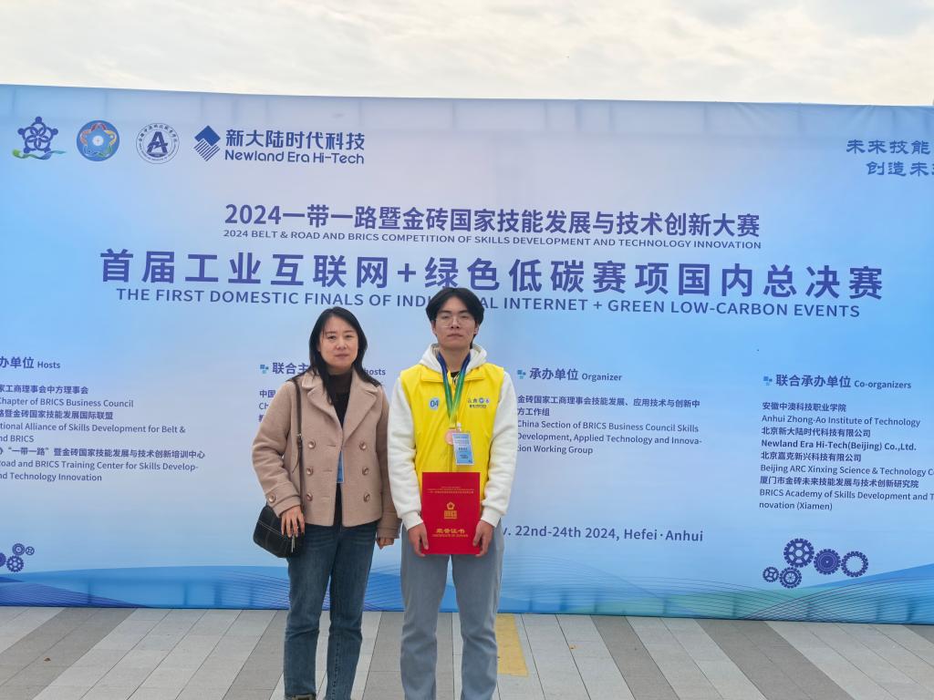 2024年11月23日,一带一路暨金砖国家技能发展与技术创新大赛首届“工业互联网+绿色低碳”赛项国内总决赛在安徽中澳科技职业学院举办。此次大赛吸引了全国52所高职院校的85支参赛队伍,经过线上预赛与线下决赛的激烈比拼,伟德官网智能制造技术学院董欣教师指导的工业互联网应用专业孙明显同学荣获三等奖。