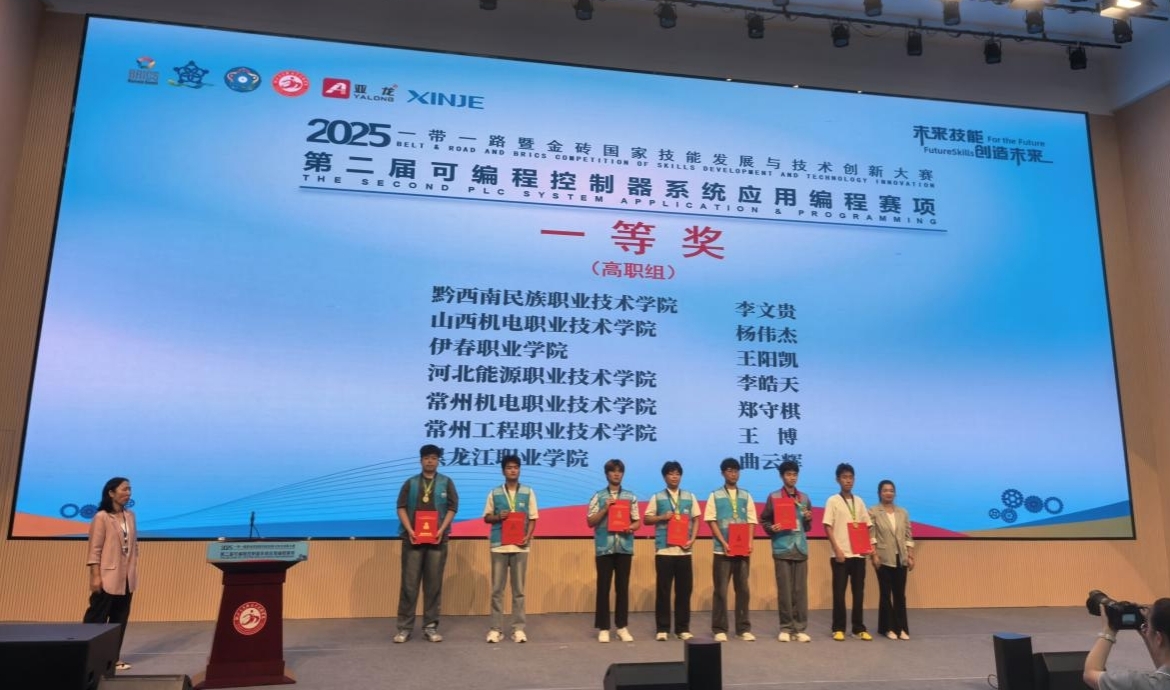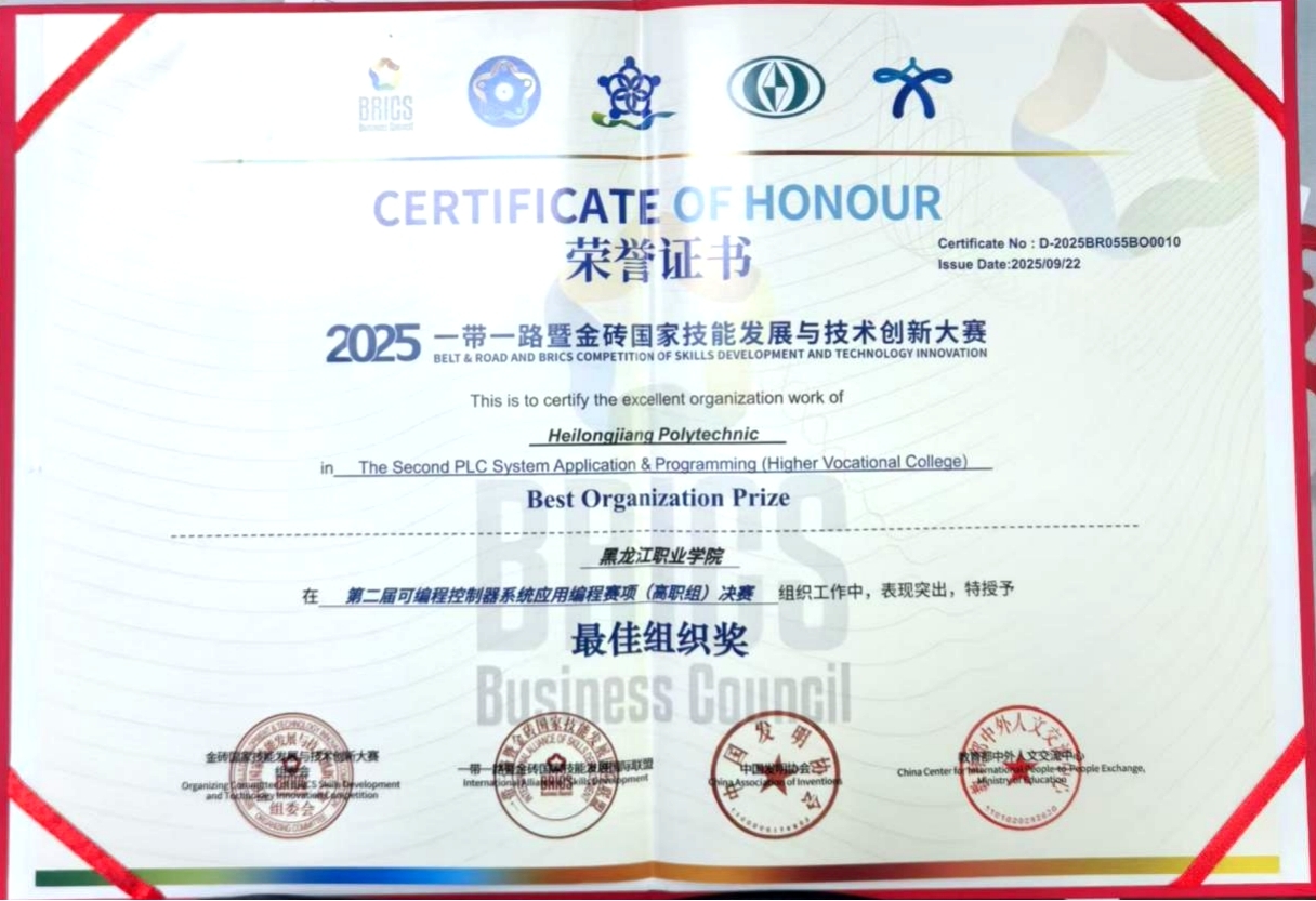 2025年“一带一路”暨金砖国家技能发展与技术创新大赛第二届可编程控制器系统应用编程赛项于9月20日在黔西南民族职业技术学院举办,来自136支高职院校队伍和41支中职院校队伍参加,通过理论和实践等环节比拼,智能制造技术学院徐伟老师指导的学生曲云辉凭借着扎实的技术功底,在众多选手中脱颖而出,全国排名第9名,斩获金牌,实现伟德官网在此赛事的新突破。大赛委员会为伟德官网颁发了最佳组织奖,对伟德官网组织备赛、参赛给予了充分肯定。