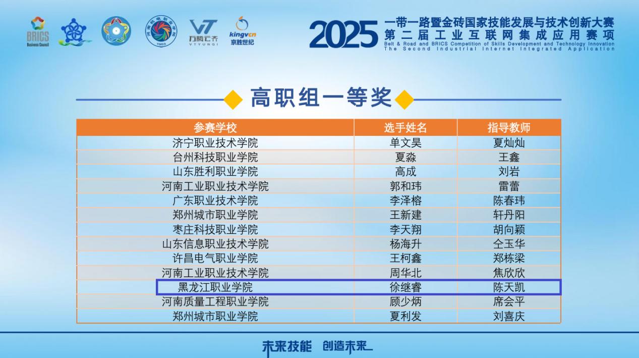 金秋时节,喜报频传。智能制造技术学院在2025年“一带一路”暨金砖国家技能发展与技术创新大赛第二届可编程控制器系统应用编程、第二届工业互联网集成应用两个赛项再填两枚金奖。
