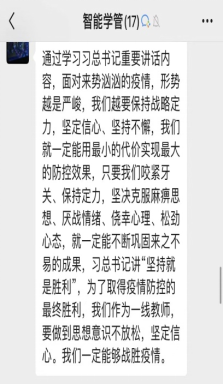 针对当前疫情情况,智能制造技术学院党总支及时创新主题党日活动形式,打破时间和空间限制。党员同志们在“线上”集结,党总支在钉钉群内商讨及制定学习主题及内容,在各支部微信群里以“分享学习资料+交流心得体会”的形式进行学习。为丰富学习内容,智能制造技术学院党总支建立“党员线上学习教育资料库”。库里跟进收集了习近平总书记最新讲话、批示指示精神,以及党纪党规、党务知识等党建基本常识。这成了机关党员的线上“精神加油站”