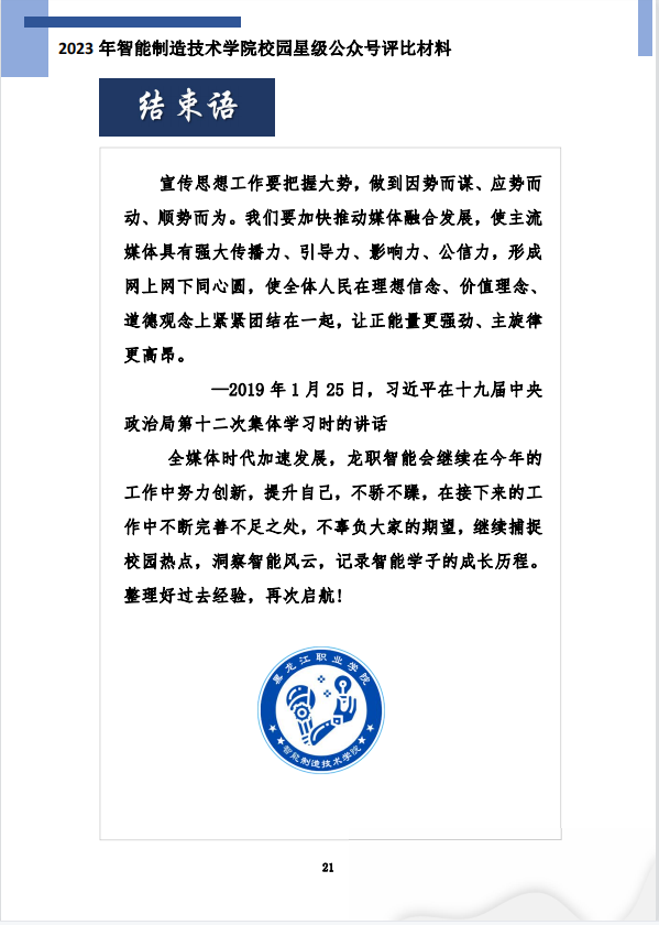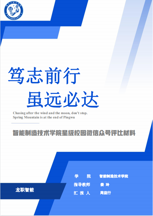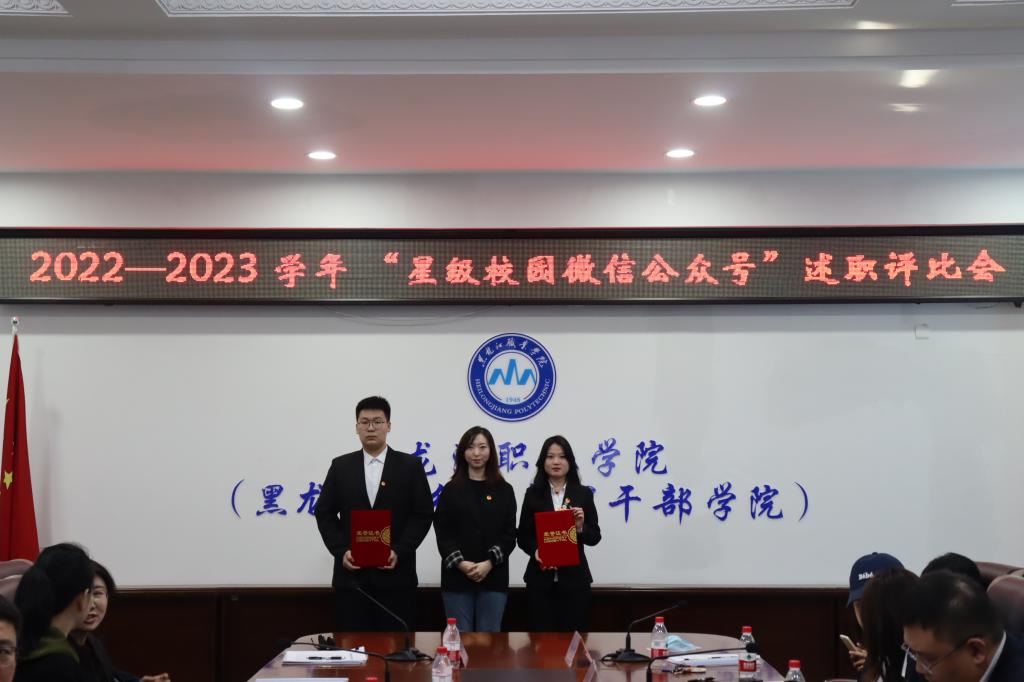 古人学问无遗力,少状功夫老始成,为进一步加强校园网络文化建设,筑牢网络主阵地、传播网络正能量,推动学校微信公众号健康持续发展,形成弘扬主旋律、传播正能量、传递好声音的网络舆论氛围,2023年4月12日,下午13:30时,在智能制造技术学院团总支书记姜玲老师的带领下,参加由校团委举办的2022-2023学年“星级校园微信公众号”述职评比会。