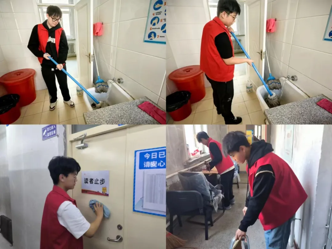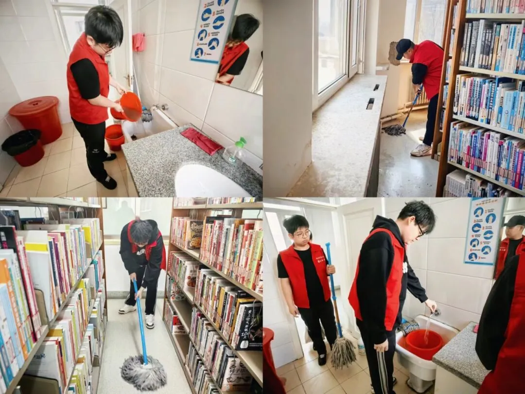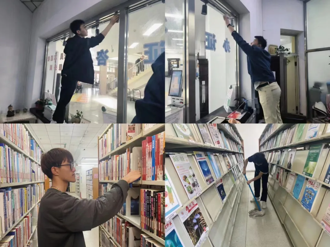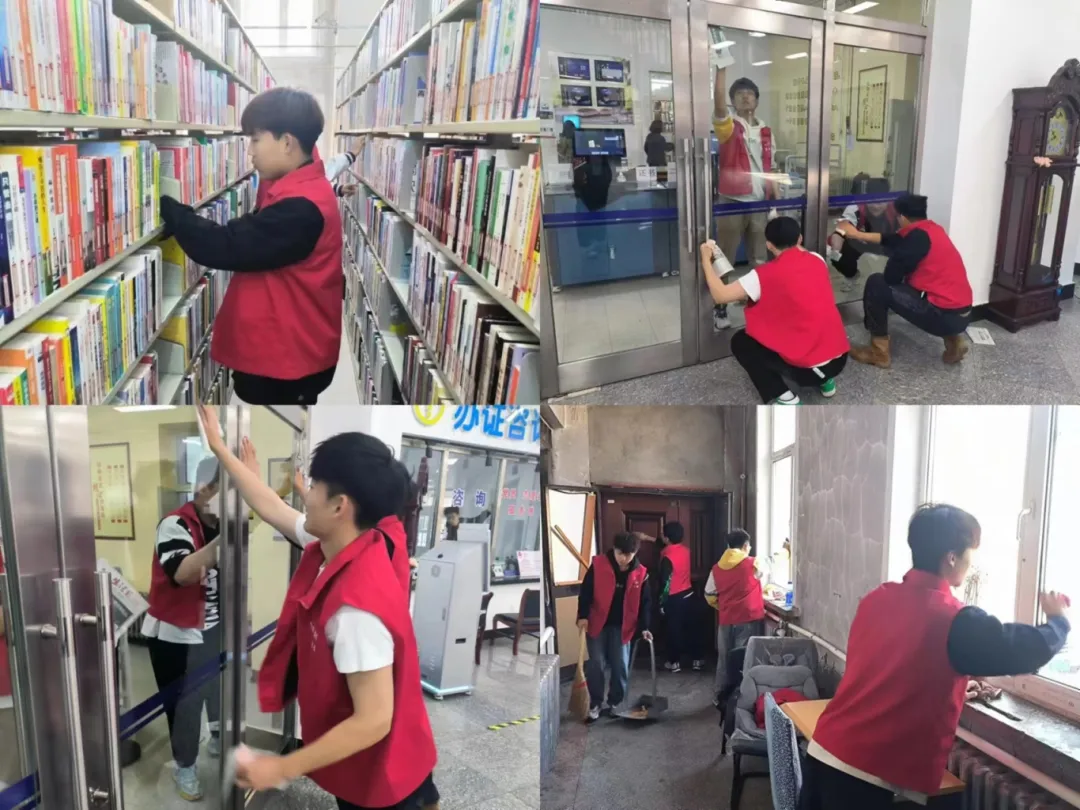 志愿服务期间,在管理员的带领下,志愿者们迅速投入到各自的岗位中,他们擦拭门窗、暖气管道与窗台,并仔细对地面进行清扫,清理书架、整理图书。清理过程中,志愿者们展现出了高度的责任感和团队合作精神。他们认真细致地完成每一项任务,不仅为读者提供了便利,也为图书馆营造了一个更加舒适、整洁的阅读环境。