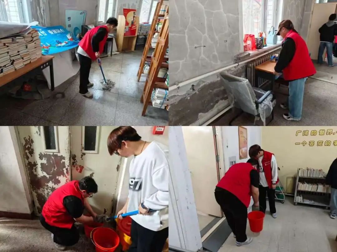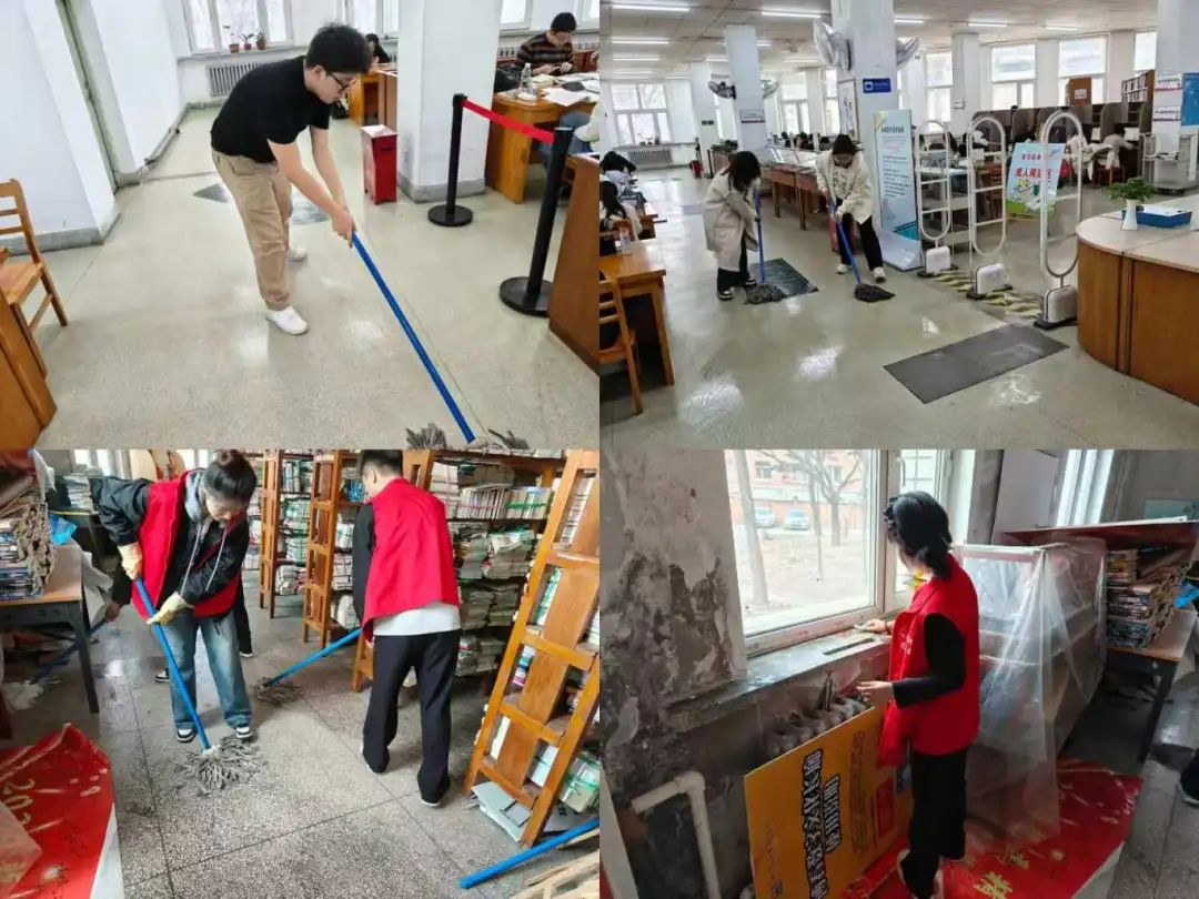 活动开始,志愿者们身穿统一的志愿马甲来到哈尔滨市图书馆,在组织人员的指挥下有序分队并明确清扫任务和清扫区域。他们分工协作,整齐有序地开展清扫活动,包括提水桶,清洗抹布,整理书架,打扫地板等。在图书馆的各个清扫区域,都可以见到志愿者们忙碌的身影。
