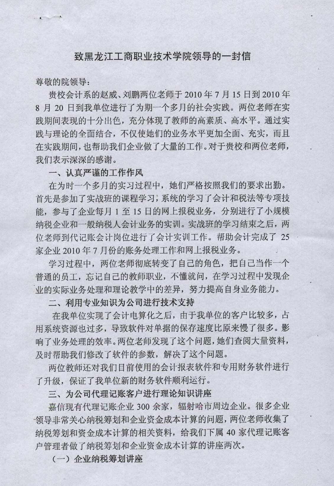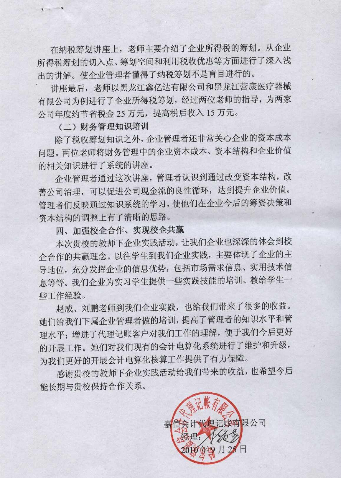 自“三个一百”工程实施以来,学院先后派出85名教师到企业实践锻炼。其中,会计系有6名老师分别到哈尔滨嘉信会计代理记账有限公司、建兴会计师事务所、华晨税务师事务所、冠丰投资担保有限公司进行实践和调研。期间,我院教师不但出色完成了实践和调研任务,而且为企业的经营管理和人员素质提高做出了贡献,受到了相关企业的欢迎和肯定。其中,赵威、刘鹏老师在哈尔滨嘉信会计代理记账公司表现突出,该公司向学院领导发来信件,对两位老师的工作表示感谢,并向学院表达了继续合作、实现双赢的愿望。