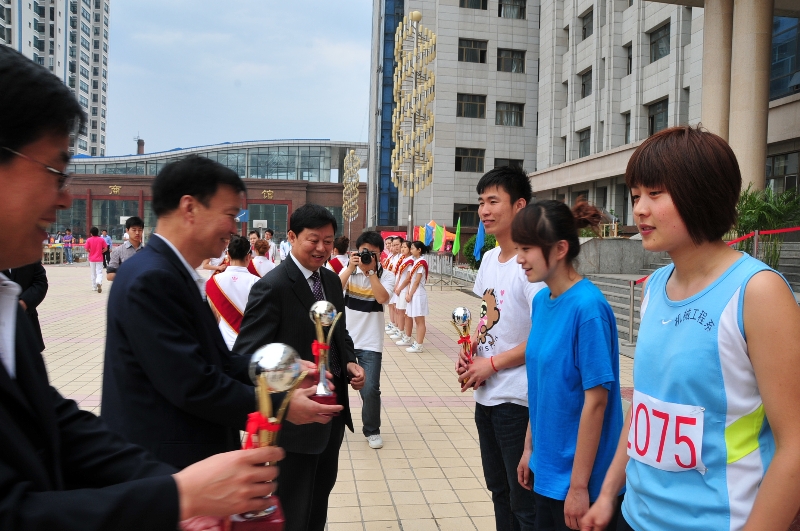 大会总裁判长陈宇辉同志宣布了运动会学生组和教工组的团体总分排名,有5项16人打破了学院运动会记录,有7个代表队获得了精神文明奖,有3个代表队获得了体育道德风尚奖,还有2个代表队获得了本届体育运动会的特别组织奖。学院领导为获奖的代表队颁发了奖杯,院长赵继会同志为本届运动会致了闭幕词。