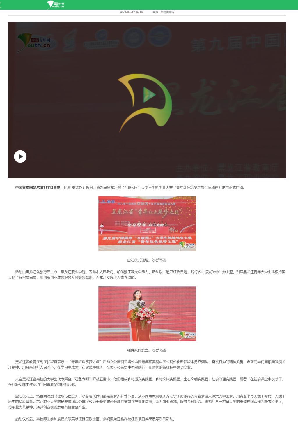 【中国青年网】第九届中国国际“互联网+”大学生创新创业大赛黑龙江省“青年红色筑梦之旅”启动