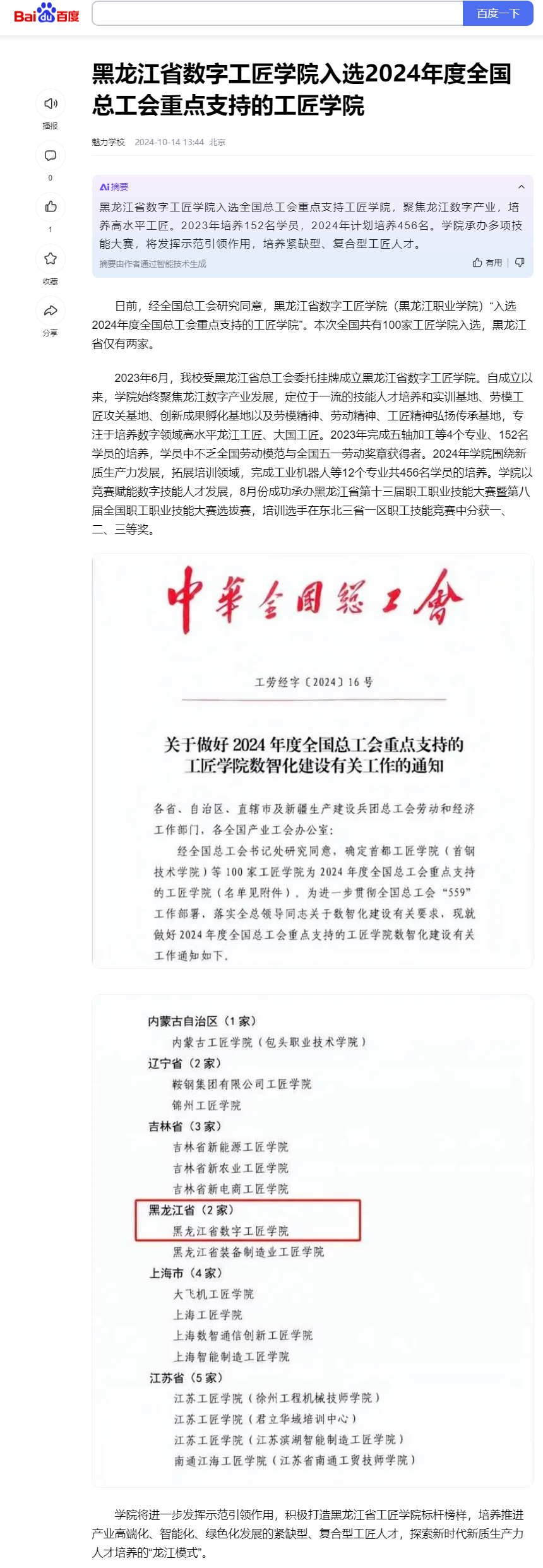 【百度新闻】黑龙江省数字工匠学院入选2024年度全国总工会重点支持的工匠学院