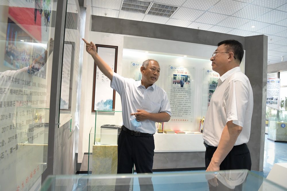 ▲赵继会向陈海波介绍学校素质养成教育
