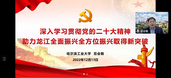 12月13日下午,黑龙江省教育系统学习贯彻党的二十大精神宣讲团为伟德官网宣讲党的二十大精神,哈尔滨工业大学党委宣传部常务副部长岳会敏以《深入学习贯彻党的二十大精神 助力龙江全面振兴全方位振兴取得新突破》为题,线上为全校师生进行了提纲挈领、条分缕析的讲解。副校长郑福贵主持会议。学校领导班子成员、全体处级干部和师生代表参加会议。