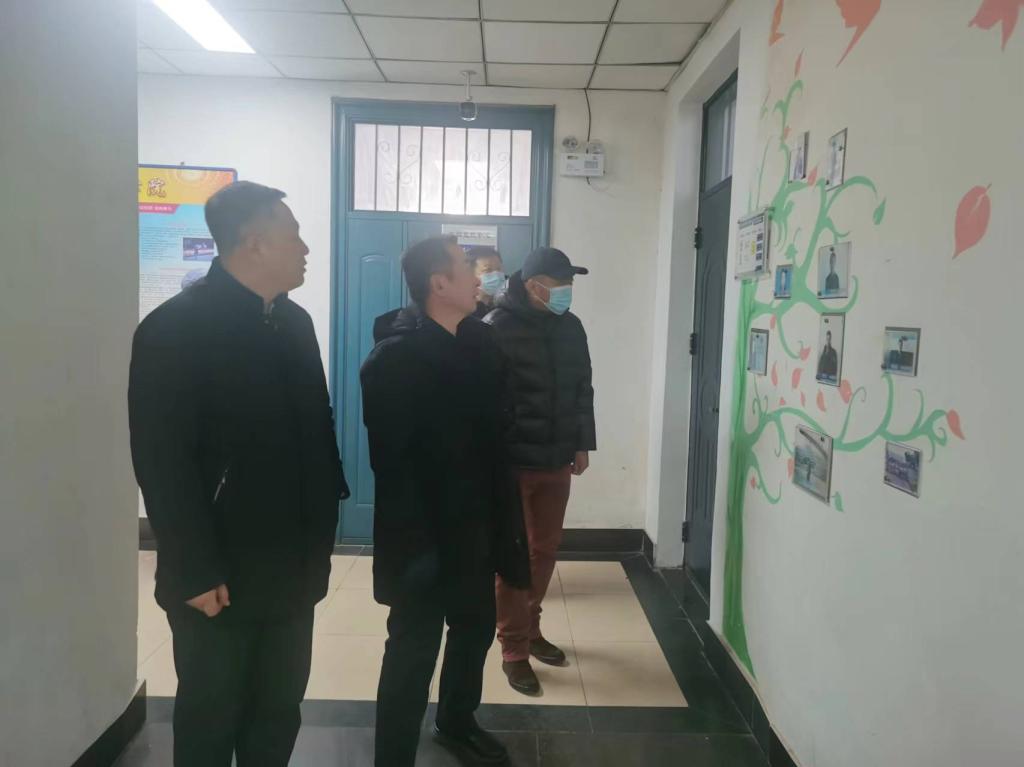 ▲检查组对墙面宣传图片进行规范检查