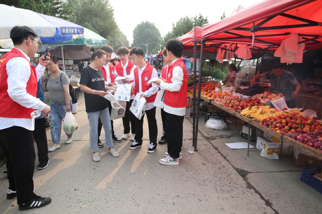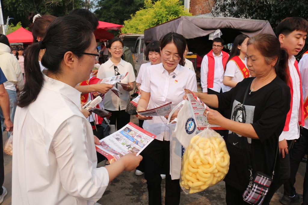▲学生志愿者向赶集村民发放食品药品安全宣传彩页