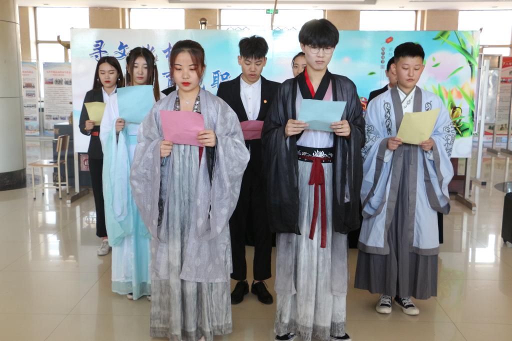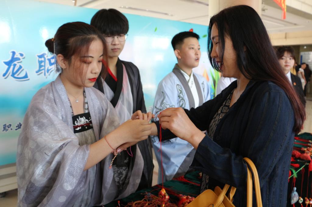 迎着明媚阳光,校大学生社团联合会的学生干部们伴随古琴声中浅吟低诵了《浣溪沙·端午》《端午怀古》《七律·端午祭屈原》《午日观竞渡》五首古诗词,晨读活动吸引了过往的师生驻足欣赏,活动现场更有身着汉服古典佳人为各位师生赠发五彩绳、香囊、小饰品等节目小礼品,营造“龙职”校园浓浓的端午氛围。