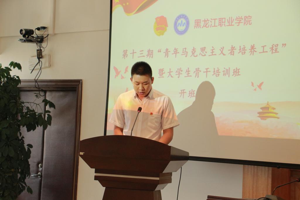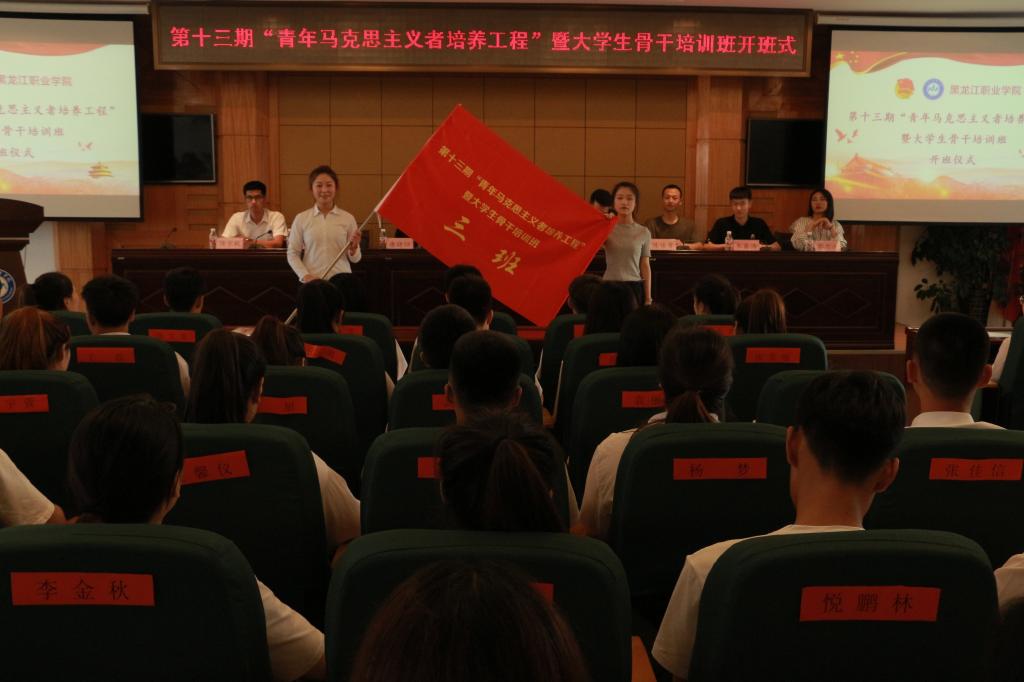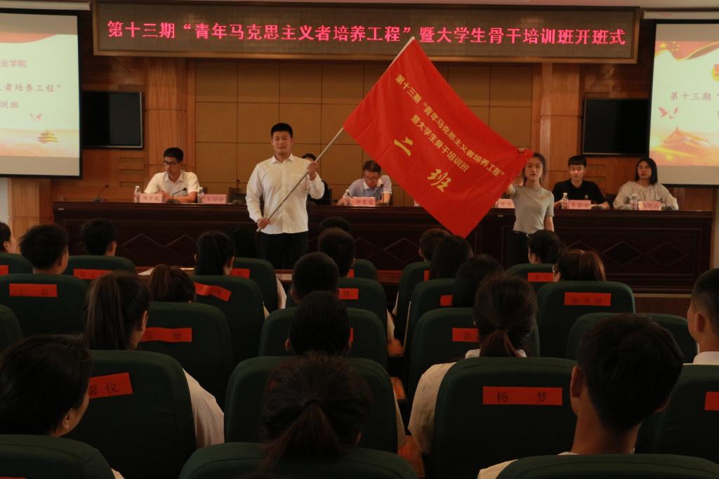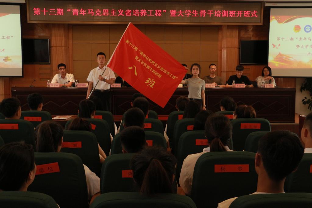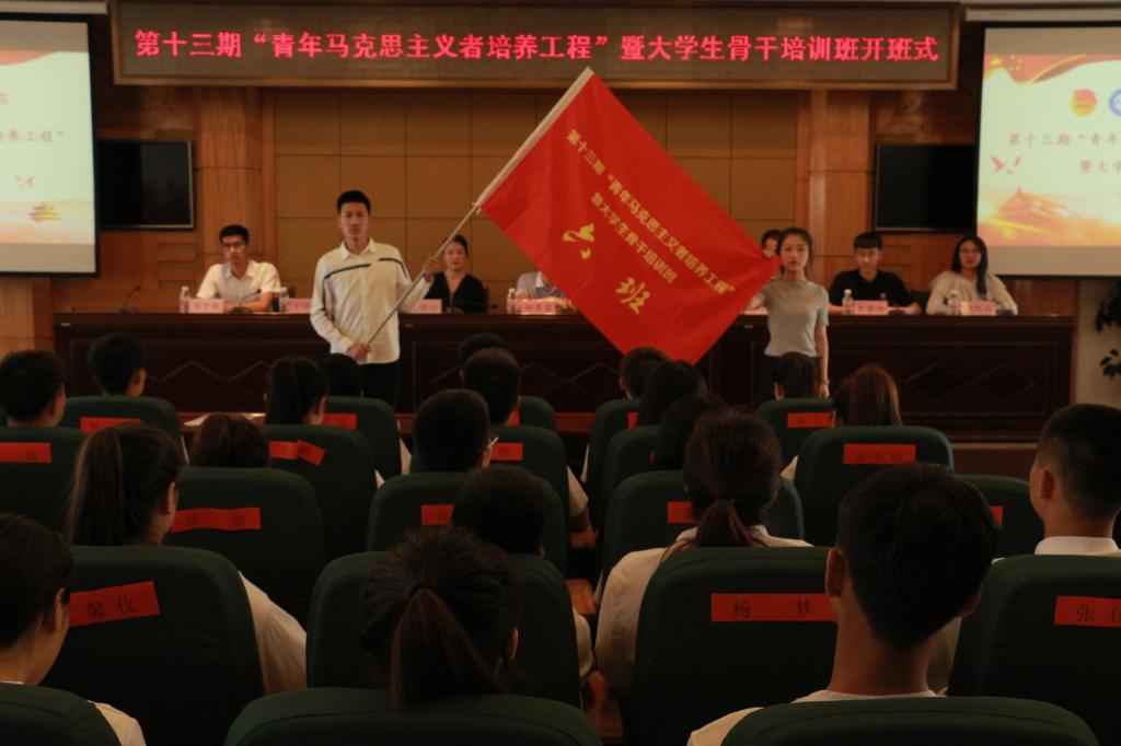会上,杜超宣读《关于举办第十三期“青年马克思主义者培养工程”暨大学生骨干培训班的通知》;唐晓恬宣读《培训班学员管理规定》;培训班班长、校学生会主席张昊睿代表学员作大会发言,并带领全体学员进行入职宣誓;邹春雷向培训班班主任王婷婷授予培训班班旗;王婷婷向八个小班班长分别授予小班旗。开班式过后,邹春雷为培训班学员作题为《青春心向党,建功新时代》的第一讲。