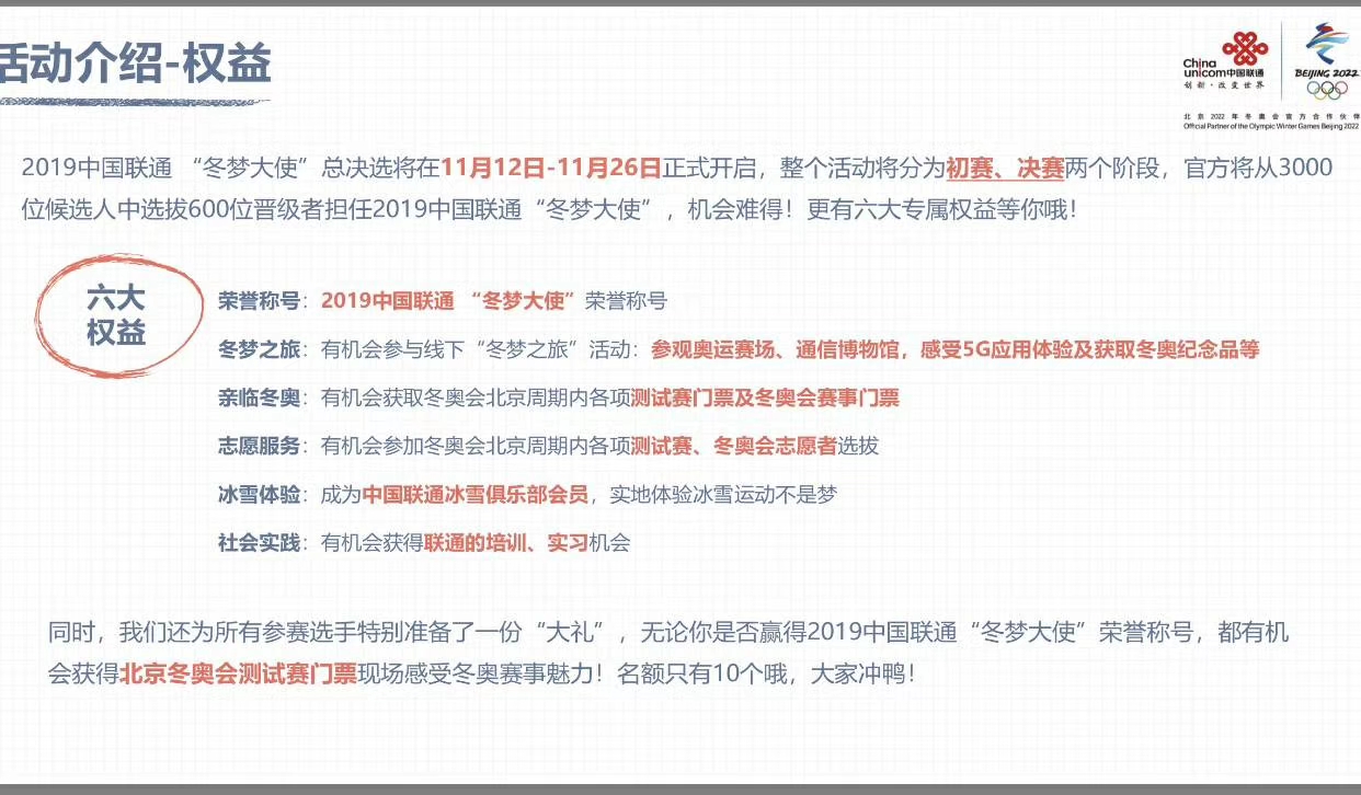 冬梦是2022年冬奥会会徽名称,此次“冬梦大使”活动面向全国共招募600名。在11月19——24日的总决选环节中,林卫丽在抖音视频的“快乐分子”赛道,通过自创的“手势舞”抖音短视频拍摄,以2782个视频点赞量和1.8万次视频播放量的成绩排名,成功当选2019中国联通“冬梦大使”。