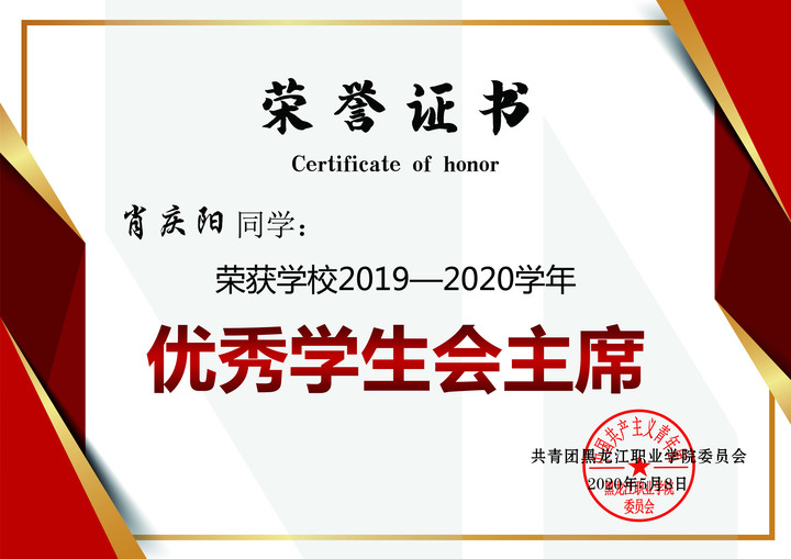 经过评审团认真评选,最终会计金融学院学生会、工商管理学院学生会和信息工程学院学生会脱颖而出,荣获2019—2020学年二级学院“标兵学生会”荣誉称号;会计金融学院王静、工商管理学院肖庆阳和信息工程学院胡银杰三名同学荣获“优秀学生会主席”荣誉称号,校团委书记邹春雷为获奖团队和个人颁发了电子版荣誉奖状和证书。