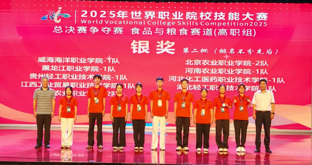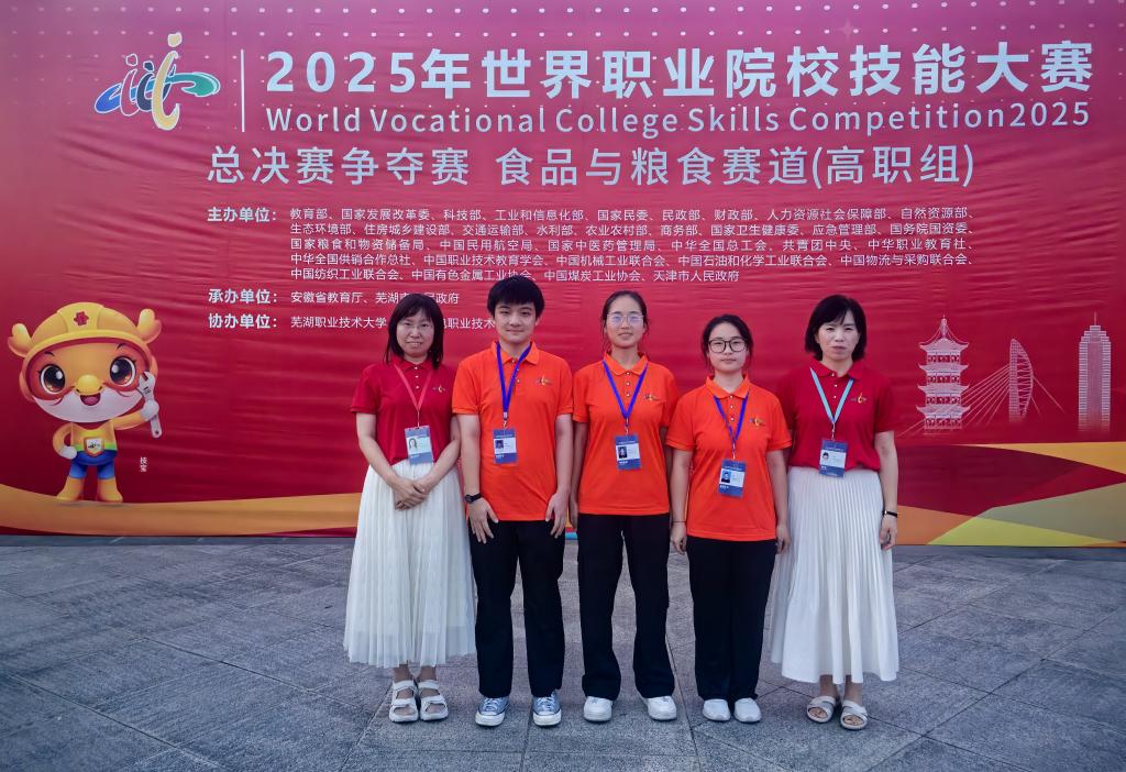 8月26日,2025年世界职业院校技能大赛食品与粮食赛道(高职组)在芜湖职业技术大学圆满落幕。来自全国31个省(自治区、直辖市)的94所高职院校100支代表队343名选手齐聚一堂,共同开启以“技炫青春、能创未来”为主题的技能盛宴。在这场高水平角逐中,伟德官网食品药品学院教师韩双、马艳梅指导的学生衣然、杨灿灿、孙珑珀组成的代表队,凭借扎实的专业理论功底、精湛的实操技艺与稳定的现场发挥,在唯一一组11支强劲对手中脱颖而出,以第二名的成绩摘得银奖。此成绩不仅刷新了伟德官网在该赛事中的历史最好成绩,也充分展现了伟德官网高质量人才培养成果。