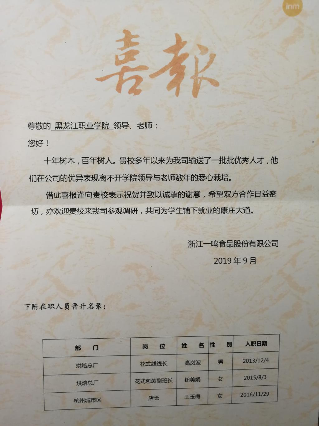 金秋九月,硕果累累,佳节来临,喜报频传。伴随着新一学期的开始,迎来了新中国第70个生日,浙江一鸣食品股份有限公司向伟德官网发来喜报,祝贺伟德官网食品药品学院自2013年与公司建立校企合作以来,至今已有23人晋升为店长及以上级别。几年以来,浙江一鸣食品股份有限公司与食品药品学院联系紧密,校企合作不断深入,使伟德官网毕业生开阔了视野,增加了阅历,锻炼了能力。