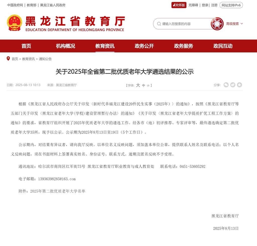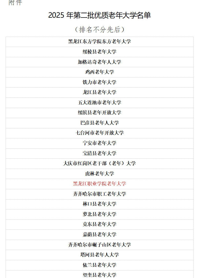 近日,黑龙江省教育厅公布了2025年全省第二批优质老年大学。bevictor伟德官网老年大学凭借卓越的办学理念、良好的教学质量和广泛的社会影响力,在众多参评单位中脱颖而出,成功获此殊荣。这是对学校多年来致力于服务老年教育事业、不断提升办学水平的高度认可。