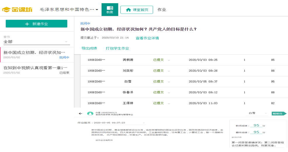 课后进行巩固拓展。学生除了在“知到”中课前预习,教师要根据教学大纲、结合形势与政策、在“金课坊”中对每个单元布置课后拓展作业,以提升学生分析问题、概括问题和明辨是非的能力。教师对作业进行批改,并进行答疑指正。