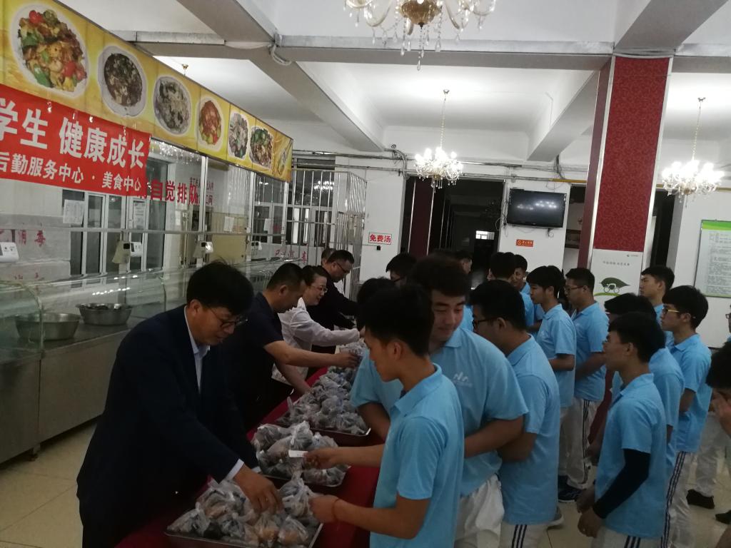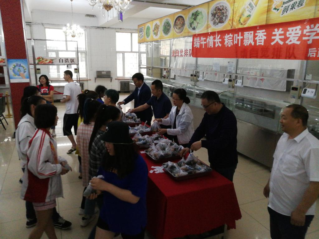 6月7日早6:50,学校党委副书记周家郁,副校长吴艳秋,学生处处长石明杰,后勤服务中心主任孙革新及后勤有关人员来到学生饮食中心等候,为就餐学生发粽子送祝福。