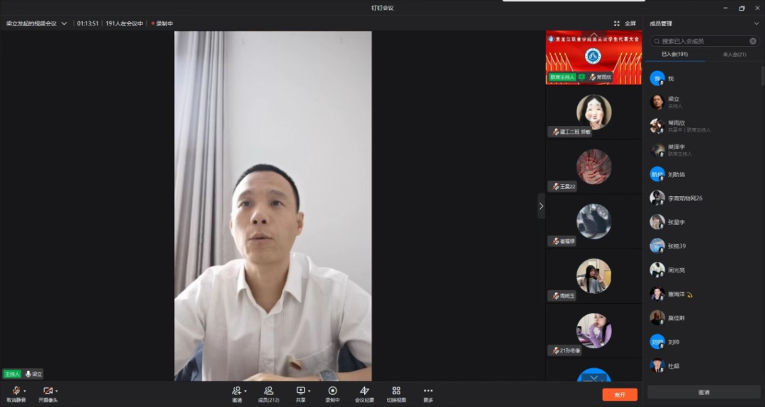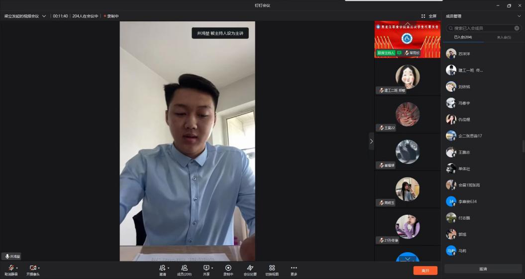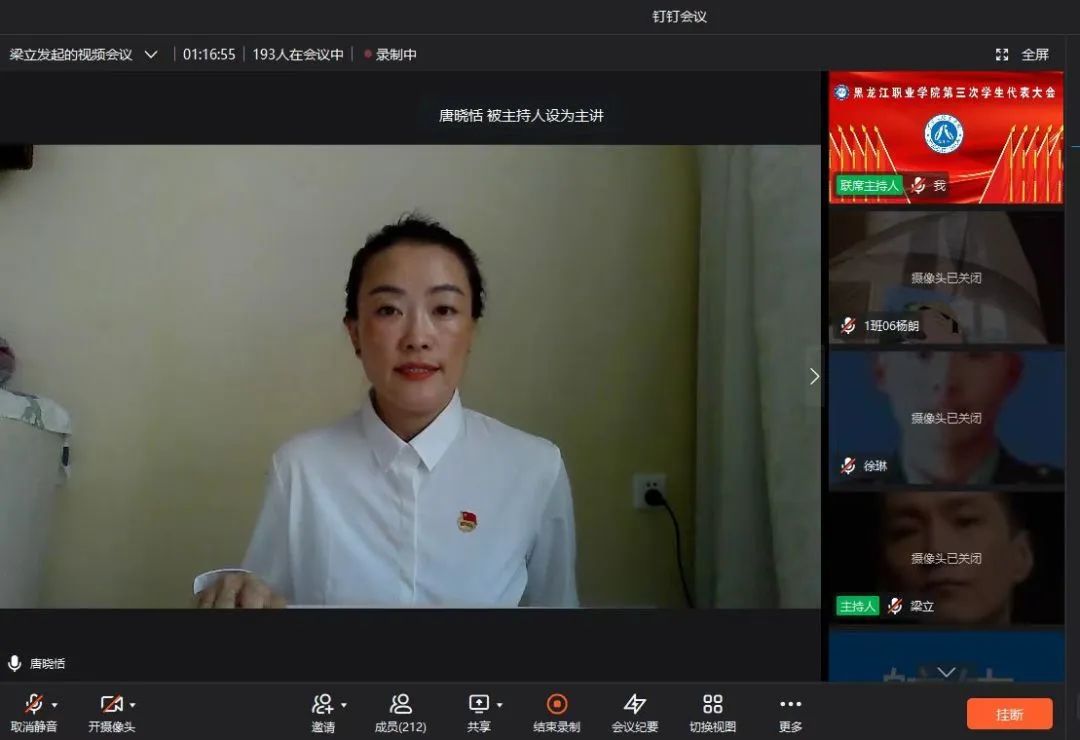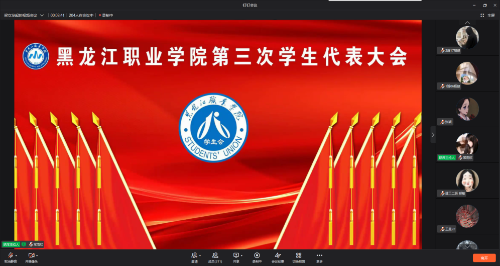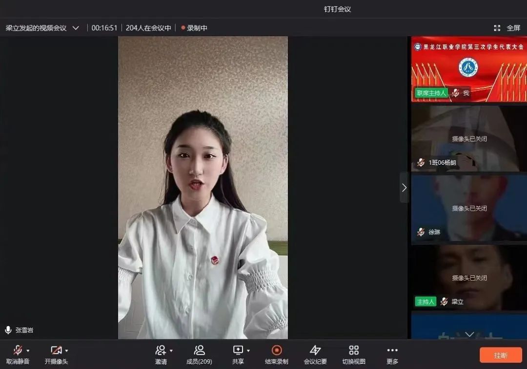 6月13日上午,伟德官网第三次学生代表大会正式会议在钉钉线上平台隆重召开。学校党委副书记、工会主席周家郁,学工部部长赵彦生,学工部党总支书记石倩,校团委书记邹春雷,哈尔滨市学联驻会主席井鸿堃及校团委全体老师和各分院团总支书记参加会议,会议由2019级校团委兼职学生副书记张雪岩主持。