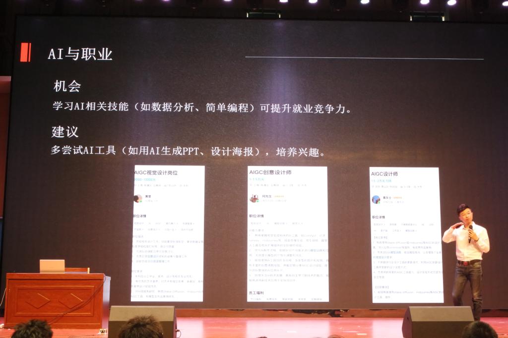 本次讲坛邀请阿里国际人工智能人才孵化中心认证讲师王华磊担任主讲,王老师以风趣幽默、通俗易懂的语言,讲解了AI基础及应用、AI挑战与责任、未来展望与行动等内容。同学们深入思考、积极互动、热烈讨论,纷纷表示对AI技术应用有了更清晰的认知,在学习和生活中不断探索实践。