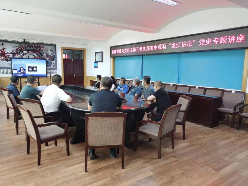 ▲后勤管理处第三支部集中观看”龙江讲坛“党史专题讲座