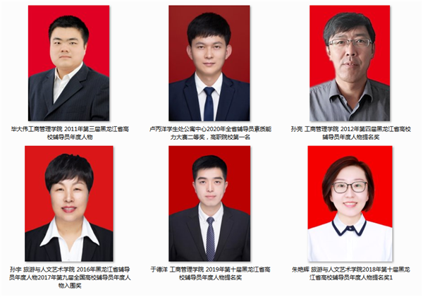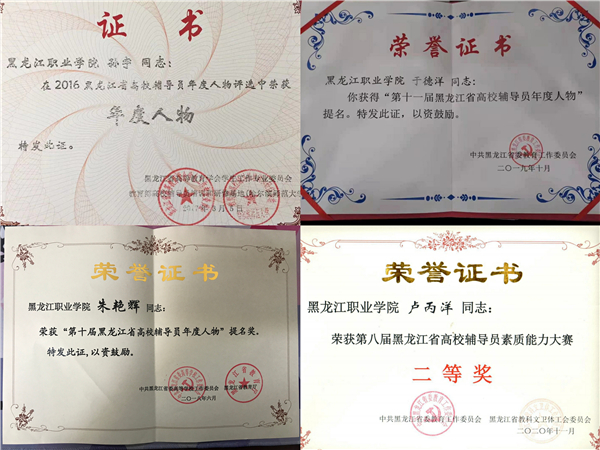 “龙职”辅导员迅速成长,在高校辅导员职业能力大赛、高校辅导员年度人物评选活动中屡获殊荣。旅游与人文艺术学院辅导员孙宇荣获2017年黑龙江省高校辅导员年度人物,获评2017年全国高校辅导员年度人物入围奖,全省高职院校第一名;朱艳辉荣获2018年省辅导员年度人物提名奖;工商管理学院辅导员于德洋荣获2019年、2020年黑龙江省辅导员年度人物提名奖;公寓辅导员卢丙洋在2020年全省辅导员素质能力大赛中获二等奖,全省高职院校第一名;公寓辅导员常通荣获2021年第十三届龙江高校辅导员年度人物提名奖。
