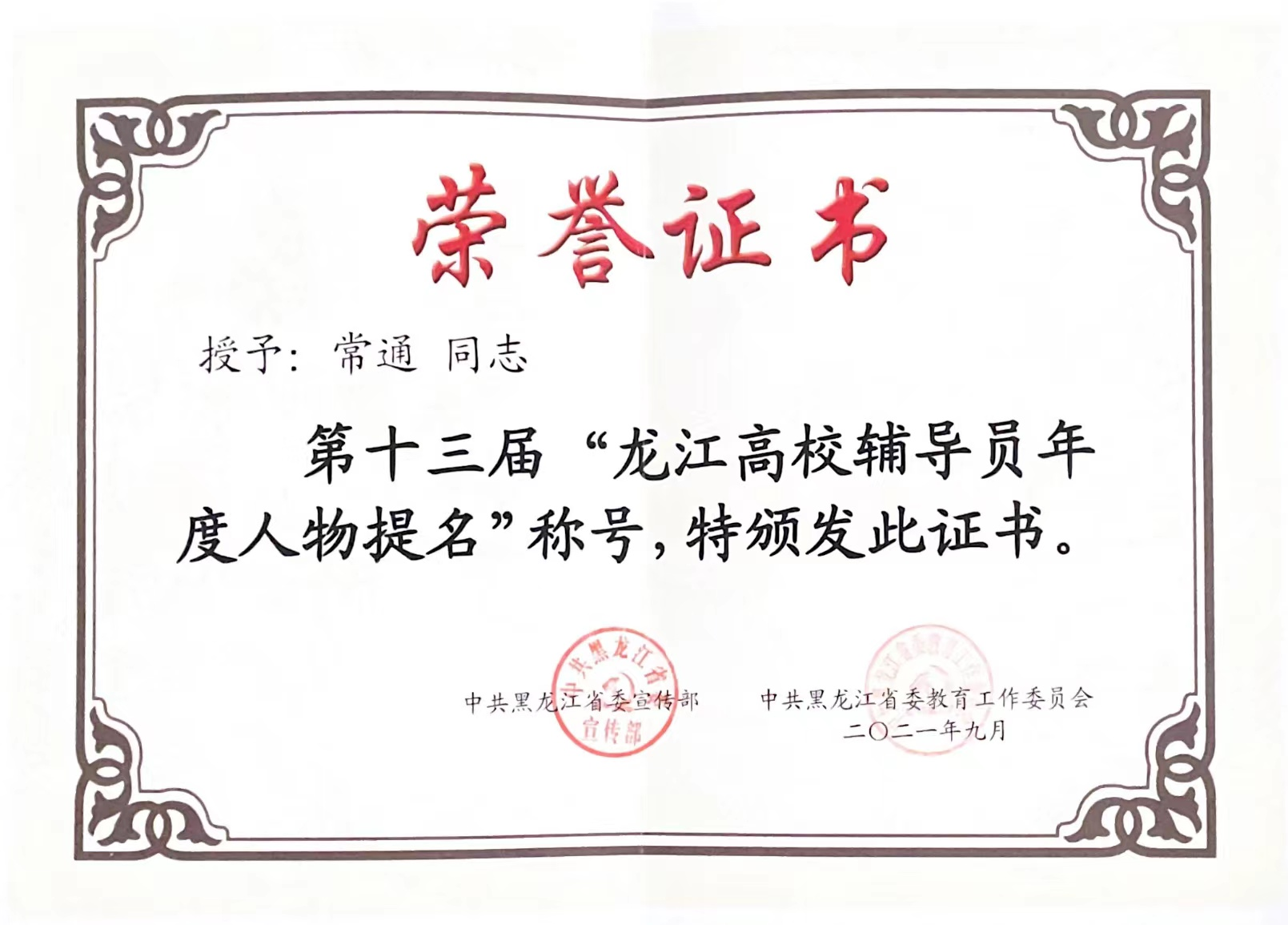 常通 学生处公寓中心2021年第十三届龙江高校辅导员年度人物提名奖