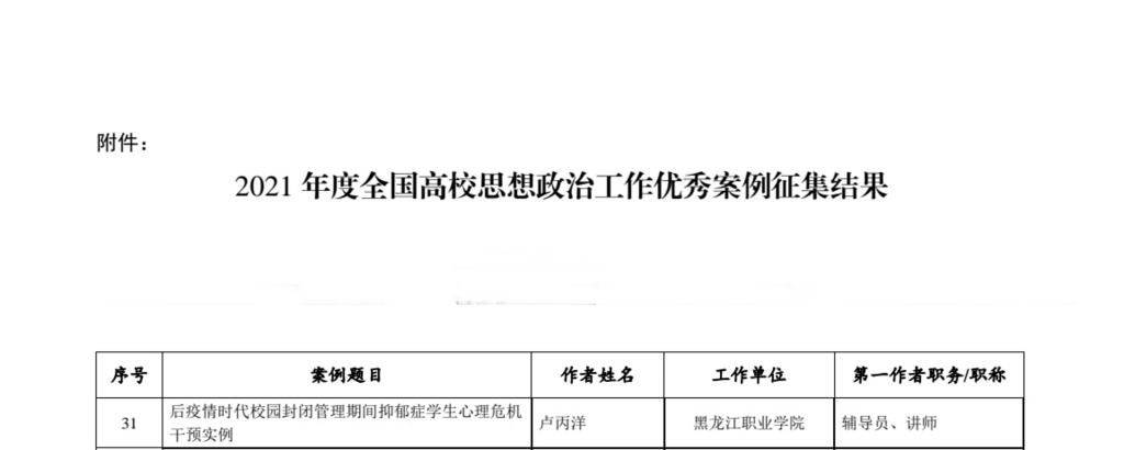 辅导员队伍专业化程度居省内高职院校前列。学校加大培训力度,积极参加教育部辅导员研修基地、黑龙江省教育厅组织的各类线下培训;积极组织“高校思政网、高校辅导员、黑龙江辅导员”等线上培训;引入“ECE卓有成效教练型教育者”“GCT生涯团体辅导”等专业化认证培训;组织高校就业指导教师线上训练营、生涯规划在学生辅导中的实务应用的培训;积极推进“易班工作站”“优秀辅导员工作室”建设,并已于2022年4月14日正式上线。近年来,学校组织参加校内外各类培训50余次,多数辅导员获得各类专业认证证书,辅导员培训力度和专业化程度在省内高职院校中均处于领先位置。伟德官网辅导员卢丙洋编写的《后疫情时代校园封闭管理期间抑郁症学生心理危机干预实例》被收录在2021年度全国高校思想政治工作优秀案例中。