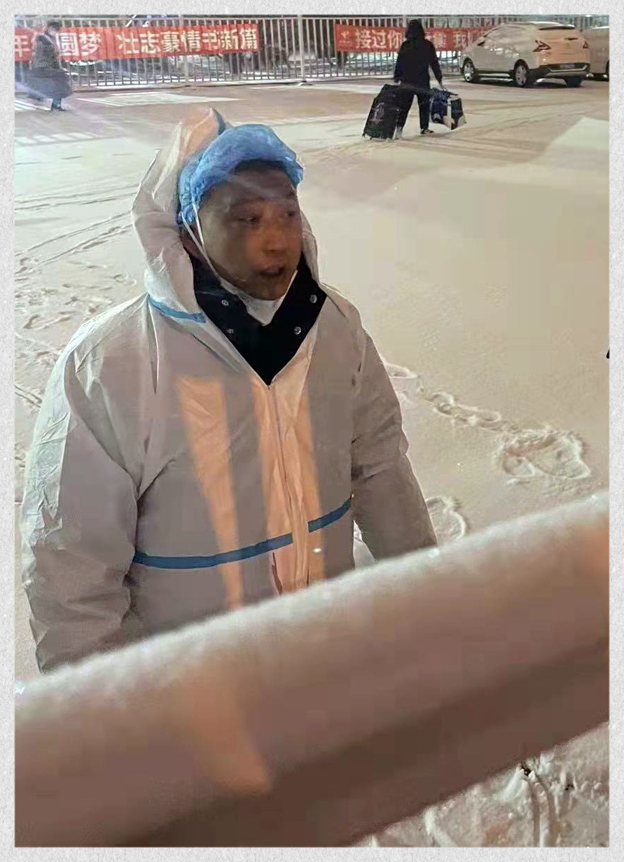 封校的第一天,学院一名学生被定为一密,情况紧急,需要将一密学生和排查出的相关接触学生送至指定的隔离酒店,作为中共党员,他不惧潜在的危险主动请缨,冲锋在前。转运工作中他冒风雪、顶严寒,坚守在转运过程中,他耐心安抚学生情绪,鼓励学生要有战胜疫情的信心,像慈父般一路呵护学生抵达隔离酒店。他把温暖带到每个学生的心间,竭尽所能的守护着每一个学生。