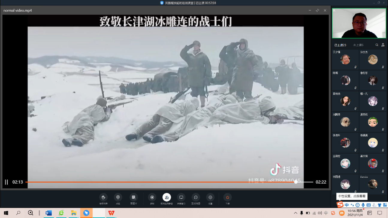 课上教师英鹏程倡议所有学生打开麦克,共同朗读志愿军战士宋阿毛的绝笔诗:“我爱亲人和祖国/更爱我的荣誉/我是一名光荣的志愿军战士/冰雪啊/我决不屈服于你/哪怕是冻死/我也要高傲地耸立在我的阵地上!”英老师号召所有同学向志愿军战士致敬,做好自己,珍惜眼前的生活,努力学习,努力奋斗。让同学们知道新冠疫情带来的困难与冰雕连战士战斗中的艰苦环境相比,真的不算什么!大家一定能遵守学校各项防疫制度,团结一心,共同战胜疫情。