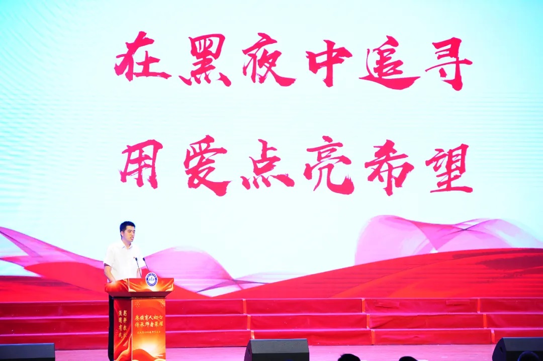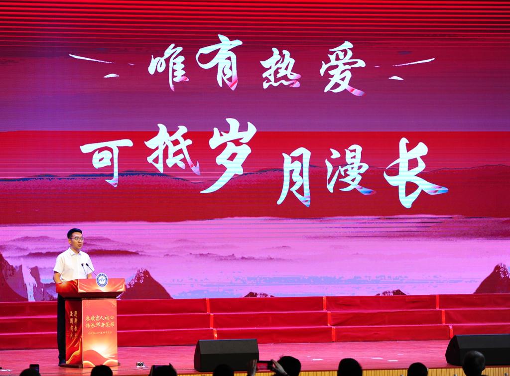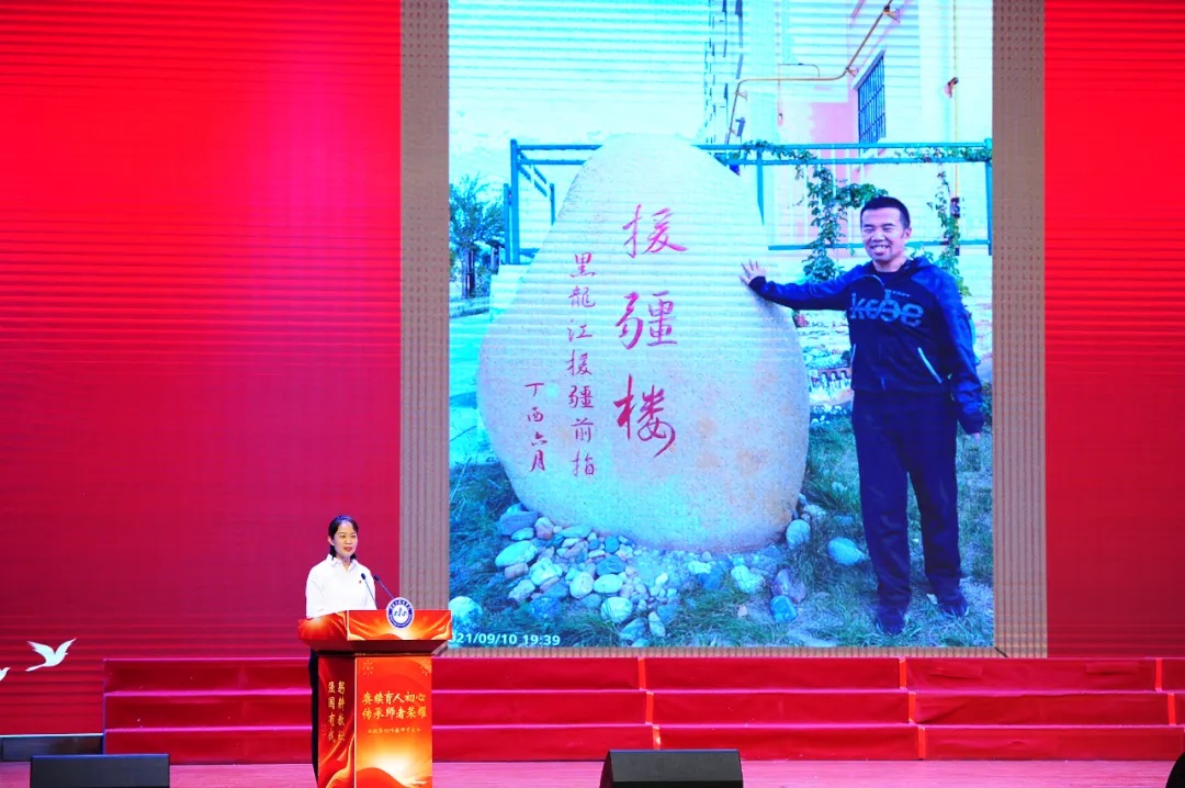 王义刚等几位老教师在台上与大家分享了自己从教多年的感悟和心里话。年轻教师为老教师献上“人民教师 无上光荣”的授带,老教师为新教师佩戴校徽。这是一种传承,更是一种信仰,在这枚小小的校徽里蕴含着老教师对年轻教师的深情告白:躬耕讲坛,强国有我。