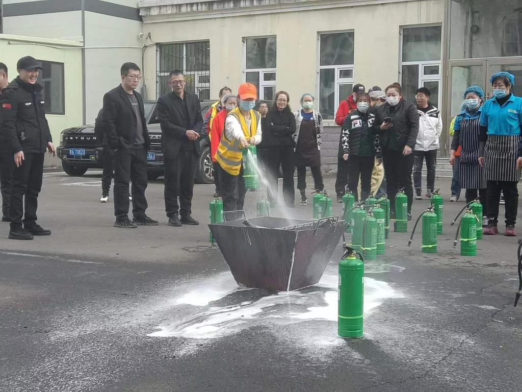 随后,在食堂外模拟突发“火情”,食堂工作人员在保卫处指导下,对模拟“火源”进行灭火实操。