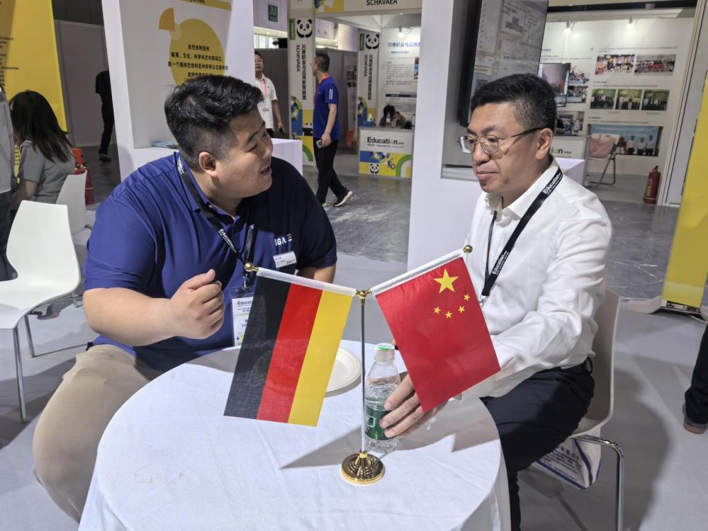 ▲何志鹏与中德职业教育产教融合联盟负责人调研交流