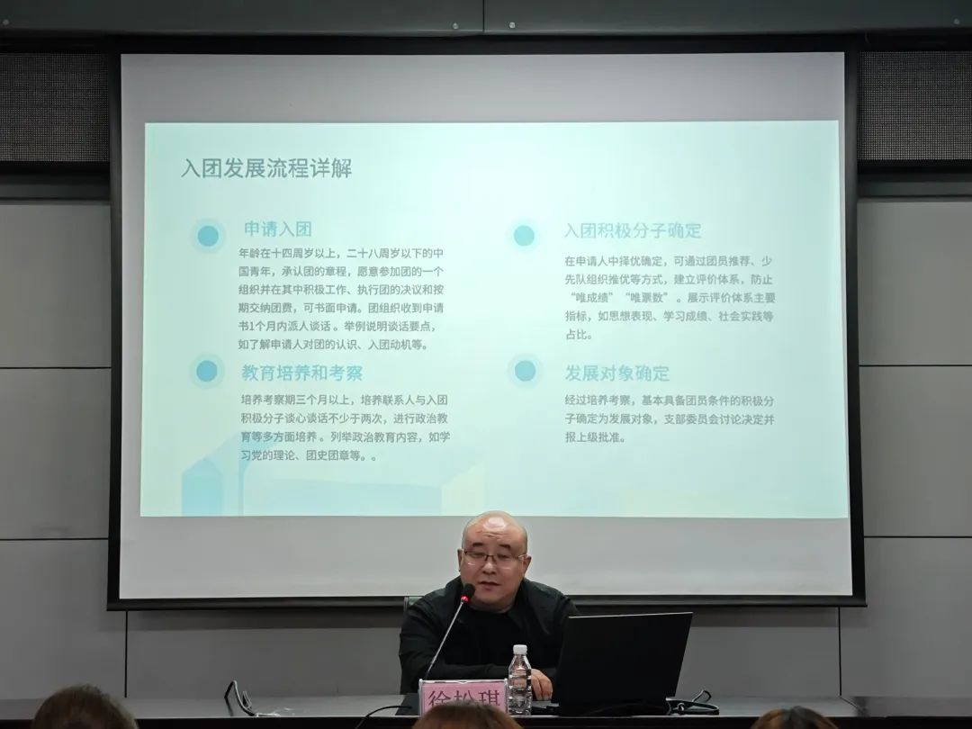 团课第六讲以“高校团员队伍建设”为主题,张茜老师围绕新时代共青团改革要求,结合高校团员发展及管理工作实际,系统阐述了团员队伍建设的重要意义。新时代高校共青团工作要求强调:“团员队伍建设是夯实团的基层基础的关键工程,必须坚持‘控制总量、优化结构、提高质量、发挥作用’的总要求。徐松琪老师提到在团员管理层面,需强化理论学习与实践锻炼结合,指出团员管理是“固本工程”,要通过常态化教育、量化考核及志愿服务实践,强化团员意识,激发组织活力。