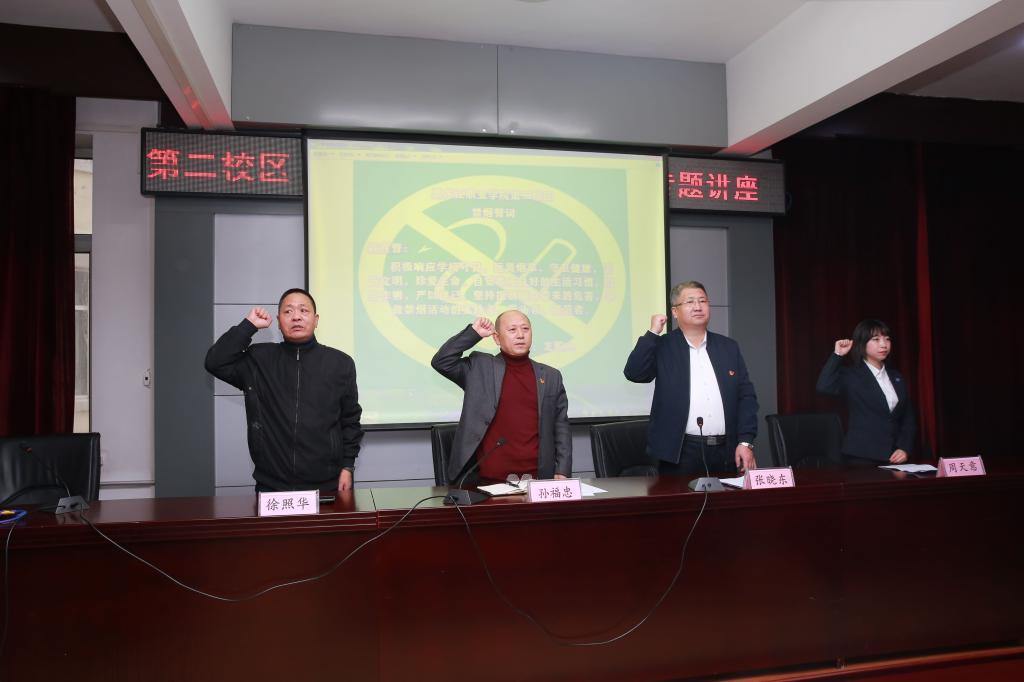 参会人员还宣读了禁烟誓词、签订了禁烟承诺书,充分体现了广大师生积极响应学校号召,坚决抵制烟草的决心。这次专题讲座的成功举办,是贯彻落实学校《关于在全校师生中全面开展禁烟活动的通知》的一项重要举措,对于第二校区推进禁烟工作,消除安全隐患,具有重大的现实意义。