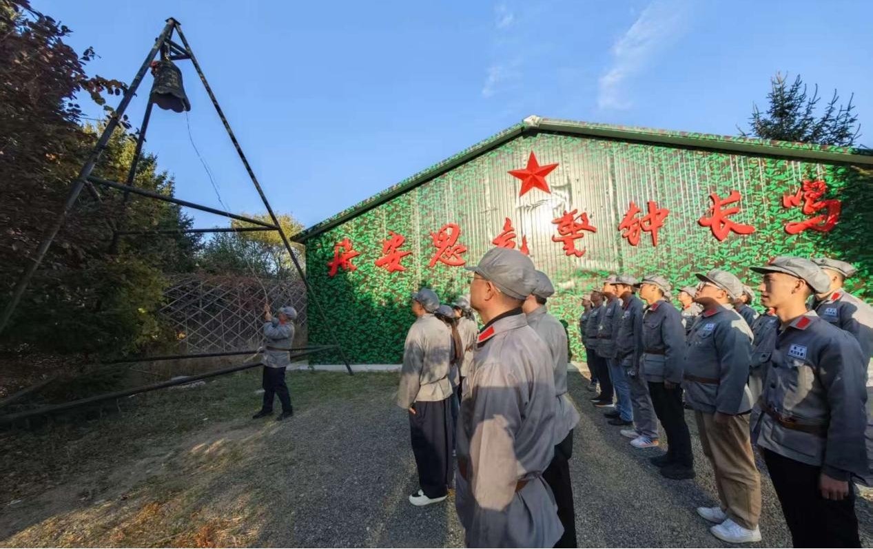 活动特别设置“忆苦思甜”环节,党员和团员们围坐木刻楞营房,吃着玉米饼、咸菜等简朴餐食,聆听教官讲述“一口雪水一口粮”的生存故事。在庄严肃穆的“警钟长鸣”仪式中,十四声钟鸣划破长空,每一声钟响都叩击着一段抗战岁月的记忆。当钟声与《松花江上》的悲怆旋律交织回荡,现场党员和团员们无不凝神肃立,许多人眼眶湿润,泪水悄然滑落。这一刻,历史的厚重与民族的情感在钟声里共鸣,抗联将士“忠诚、担当、血性”的精神通过艺术化的仪式直抵人心。